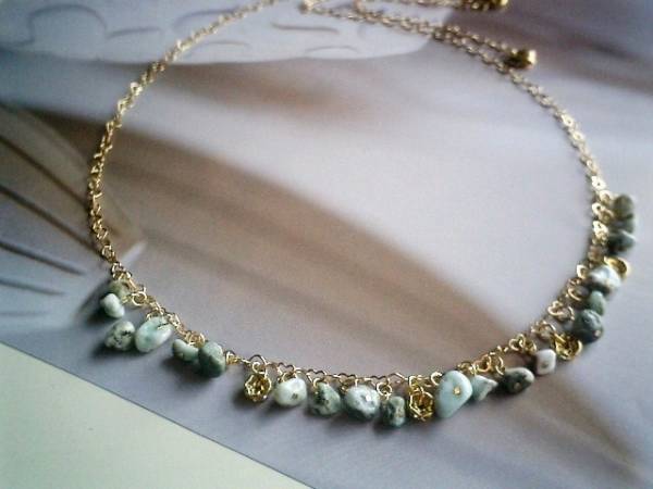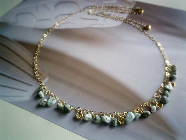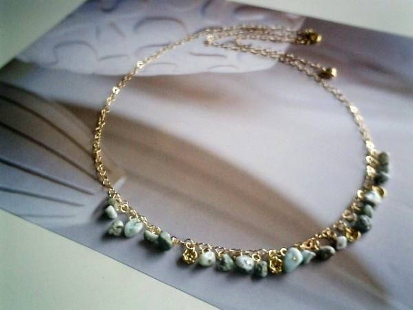 天使の時間・・シリーズです♪やさしい水色・・爽やかなラリマーのネックレスです♪ナチュラルな風合いのラリマーにラインストーンのロンデムや小さなハートのデザインチェーンを合わせて可憐な表情です♪ラリマーは4ミリから11ミリ位までのさざれ、ラインストーンは6ミリ位です♪長さは全長80センチ位で調節自由です♪チョーカー風にされても可愛いです♪お揃いのブレスレットも出品しています♪ハンドメイドをご理解頂いてノークレーム、ノーリターンでお願いします