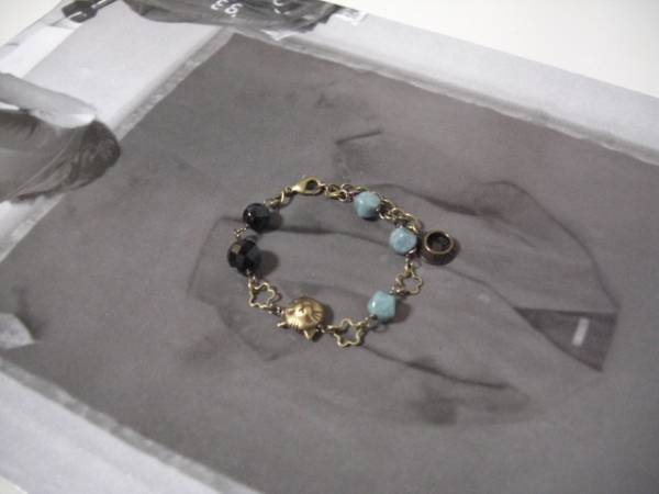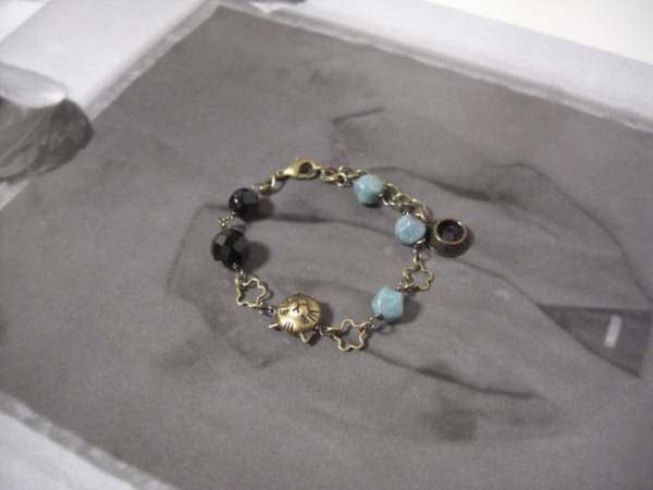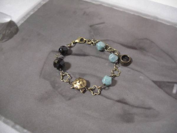 やさしい春色・・シリーズです♪日曜日の猫さん・・シックなオニキスと猫さんのブレスレットです♪漆黒のオニキスにターコイズ色のアンティークビーズや猫さんのチャームやフラワーリングを合わせてロマンチックな表情です♪オニキスは8ミリ、10ミリのランダムカット、猫さんは10ミリ位です♪長さは全長23センチ位で調節自由です♪お揃いのネックレスやピアスも出品しています♪シンプルで飽きのこないいつまでも着けられるデザインを考えて作りました♪ハンドメイドをご理解頂いてノークレーム、ノーリターンでお願いします