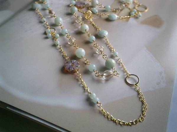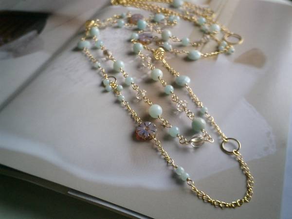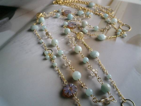 ビター・スィート・・シリーズです♪水色のワンピース・・可憐なアマゾナイトのネックレス2本セットです♪重ねてネックレスに1本をブレスレットにと色々な組み合わせで楽しんでいただけます♪6ミリ、8ミリの丸玉のアマゾナイトはデザインチェコビーズを合わせました♪長さは全長77センチ位で調節自由です♪長い方のネックレスは10ミリのコインカット、3ミリ、4ミリの丸玉のアマゾナイトです♪透かし模様のチェコビーズやワイヤーボールやデザインリングを合わせてアンティークモダンしています♪長さは全長100センチ位で調節自由です♪それぞれ単品やブレスレットやピアスも出品しています♪シンプルで長く着けていただけるデザインを考えて作りました♪ハンドメイドをご理解頂いてノークレーム、ノーリターンでお願いします