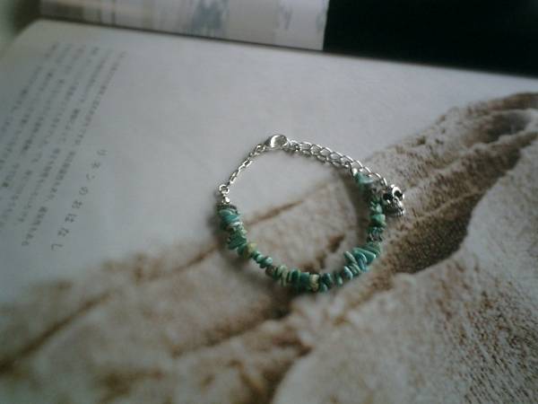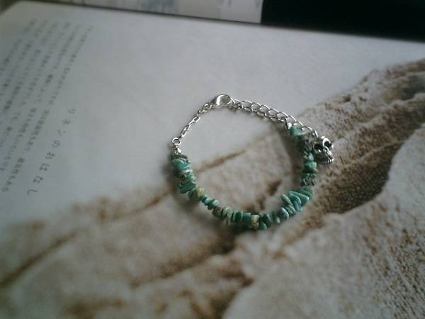 ビター・スィート・・シリーズです♪ターコイズと髑髏・・神秘的なグリーンターコイズのブレスレットです♪さざれのターコイズに髑髏さんのチャームを添えてキュートな表情です♪6ミリから9ミリ位のさざれのターコイズはデザインチェーンを合わせてスタイリッシュな表情です♪長さは16センチ+アジャスター6センチで最長22センチ位です♪お揃いのネックレストも出品しています♪シンプルで長く着けていただけるデザインを考えて作りました♪ハンドメイドをご理解頂いてノークレーム、ノーリターンでお願いします