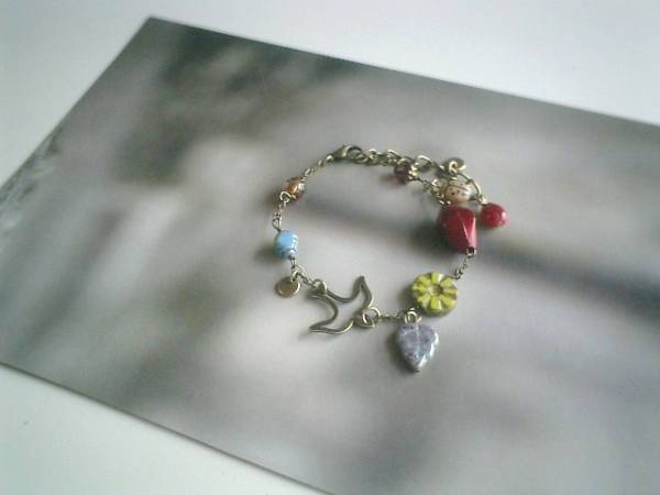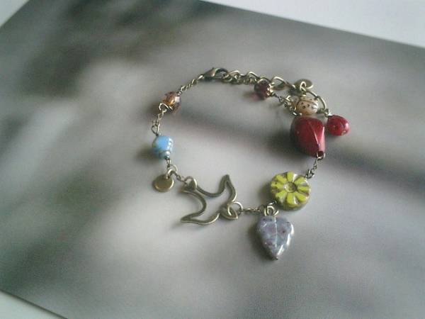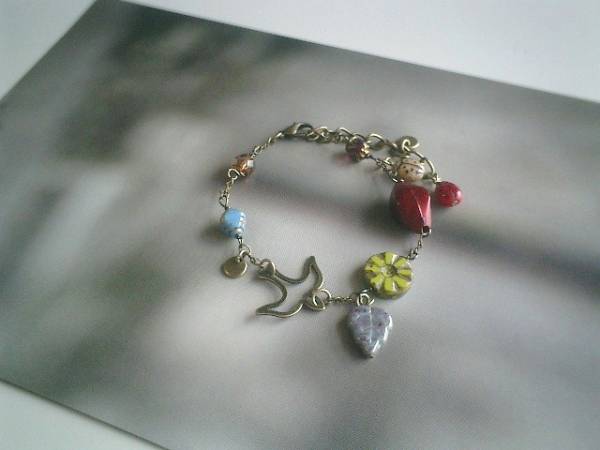 秋の小鳥さん・・シリーズです♪キャンディ・モチーフ・・キュートなチェコビーズやメタルチャームのブレスレットです♪透かしの小鳥さんを合わせてキュート・モダンしています♪チェコビーズはベージュやダークレッドのてんとう虫やお花模様、リーフ、チャームは透かしや琥珀色やブロンズ色などシックな秋色を合わせました♪長さは全長23センチ位で調節自由です♪お揃いのネックレスやピアスも出品しています♪シンプルで飽きのこないいつまでも着けられるデザインを考えて作りました!ハンドメイドをご理解頂いてノークレーム、ノーリターンでお願いします