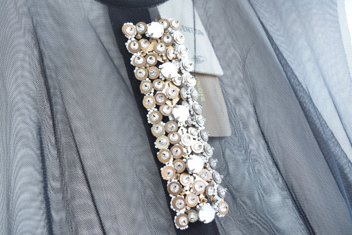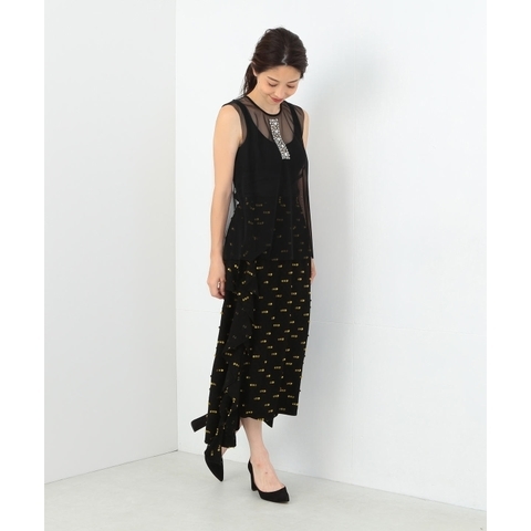 特徴: 色んなレイヤードが楽しめる・チュールの透け感がエレガントな女性らしい一枚・ベージュにはブラックのフラワーモチーフ、ブラックにはスパンコールとビジューを配したデザインが魅力・パーティなどの華やかなシーンでも活躍