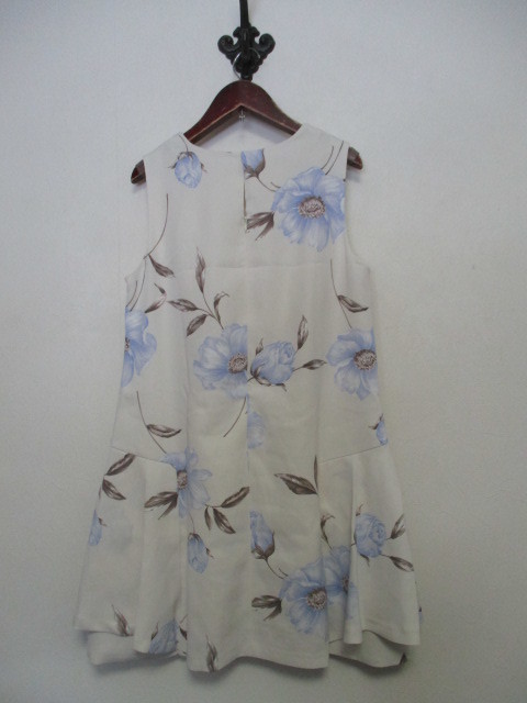 | 商品紹介 | 若干クリームがかった白地のノースリーブミニワンピースです。 花柄プリントが全体に入っていて、 プリント部分はくすんだブルーや茶等の色が使われています。 両横裾に切替えがあり、少しフレアっぽくなっています。 《素材》 本体・別布・裏地:ポリエステル100% |