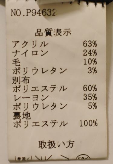 (表地)  アクリル63%  ナイロン24%  毛10%  ポリウレタン3%