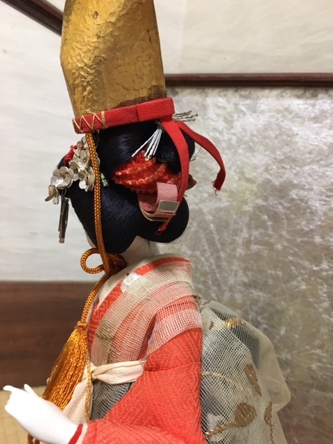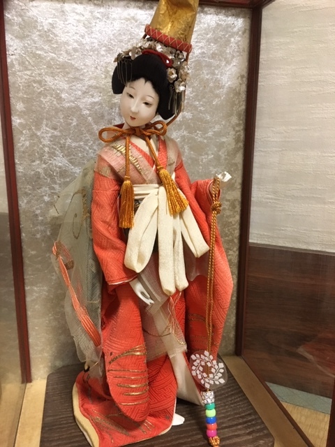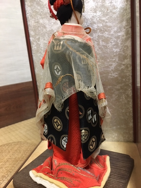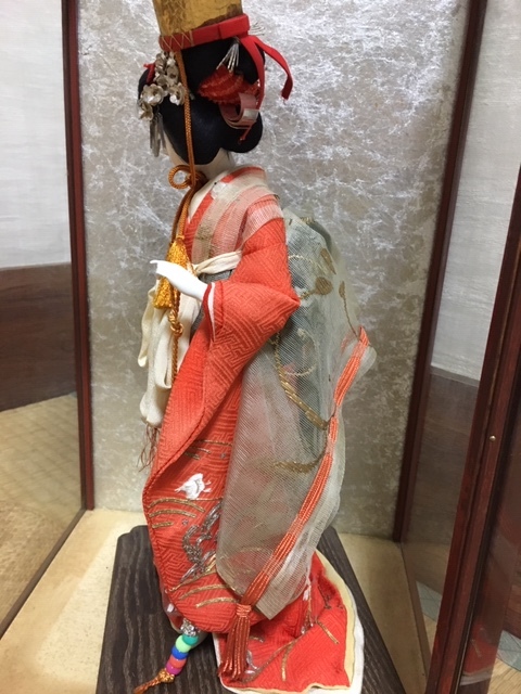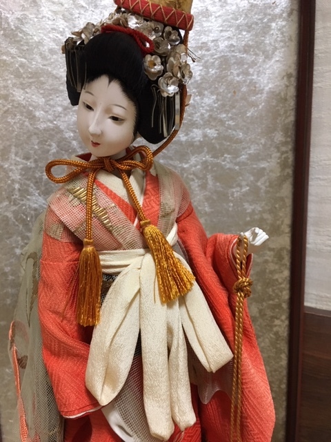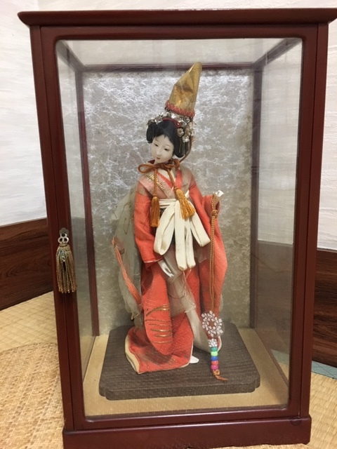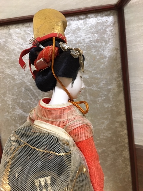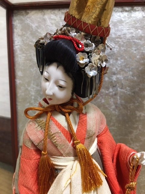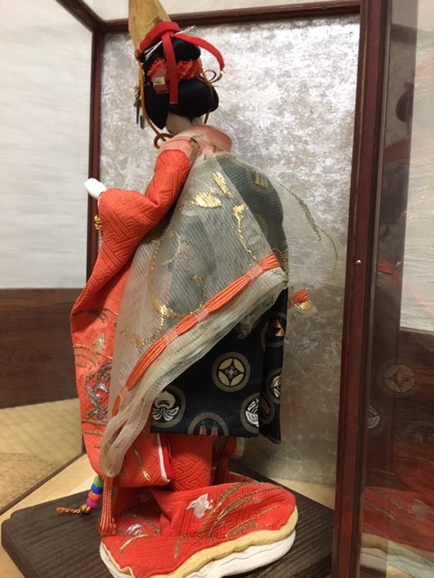 とてもお顔と姿の美しい、元汐汲み/現五色玉・クリスタル硝子玉を持つ舞姫人形(台含む高さ約33cm)ケース入(約28×23×43cm) 、アンティークですので、詳細はご了承ください!お気に召した方はいかがですか?