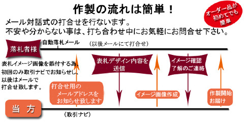 お取引は、初回のみ「取引ナビ」でご連絡致します。 完成イメージ画像の添付を行う為、以後はメールでの打合せとなります。 【落札者様】 落札 ↓ ↓ ↓ 【当方】 取引ナビにて、打合せ用のメールアドレスをお知らせ致します。 発送先やデザイン内容など必要事項のフォームも合わせてお知らせ致します。 ↓ ↓ ↓ 【落札者様】 打合せ用メールアドレスにフォームをコピーして、必要事項をご記載下さい。 ↓ ↓ ↓ 【当方】 デザイン内容に沿ってイメージ画像を作成し、メール添付致します。 (イメージ画像作成は2パターンまでとなります。) ↓ ↓ ↓ 【落札者様】 イメージ画像に誤字脱字が無いかご確認の上、了解のご連絡を下さい。 ↓ ↓ ↓ 【当方】 ご入金確認後から作製を開始致します。 1週間以内にはお送り致します。 発送の際は、宅配便お問合せ番号をご連絡させて頂きます。 ご連絡は、落札日から2日以内を目処に行ないますが、 スムーズにお取引が出来ますよう、出来るだけ早くご連絡するように心掛けます。 宜しくお願い致します。 【携帯メールからご連絡の方】 迷惑メール設定をされている場合は、 お知らせするメールアドレスのドメイン解除をお願い致します。 当方からの画像添付したメールが、受信出来るようにお願い致します。 打合せにご連絡頂いたメールアドレスは、打合せ以外、一切使用致しませんので、 ご安心下さい。 当工房はネット通販8年目の信頼と実績のある工房です。 大手メーカーとのお取引もございます。 安心してお任せ下さい! 〒675-1215 兵庫県加古川市上荘町都台3-3-1 しど彫刻 TEL 079-439-1900 営業時間 9時~19時 定休日 土日祝日 https://www.tyoukoku.com |
