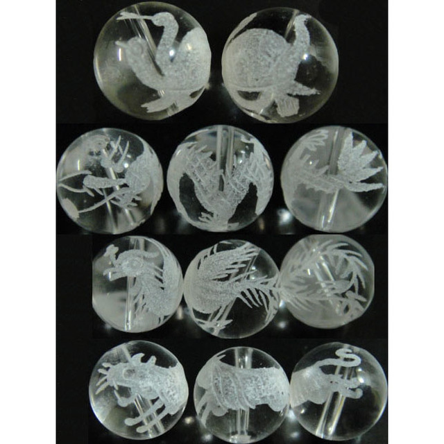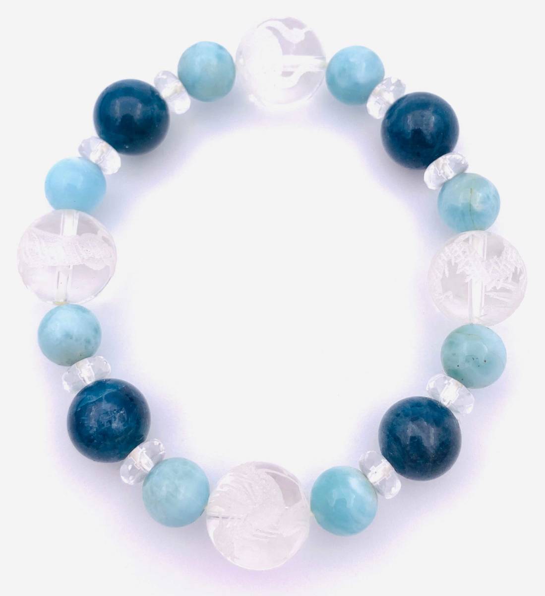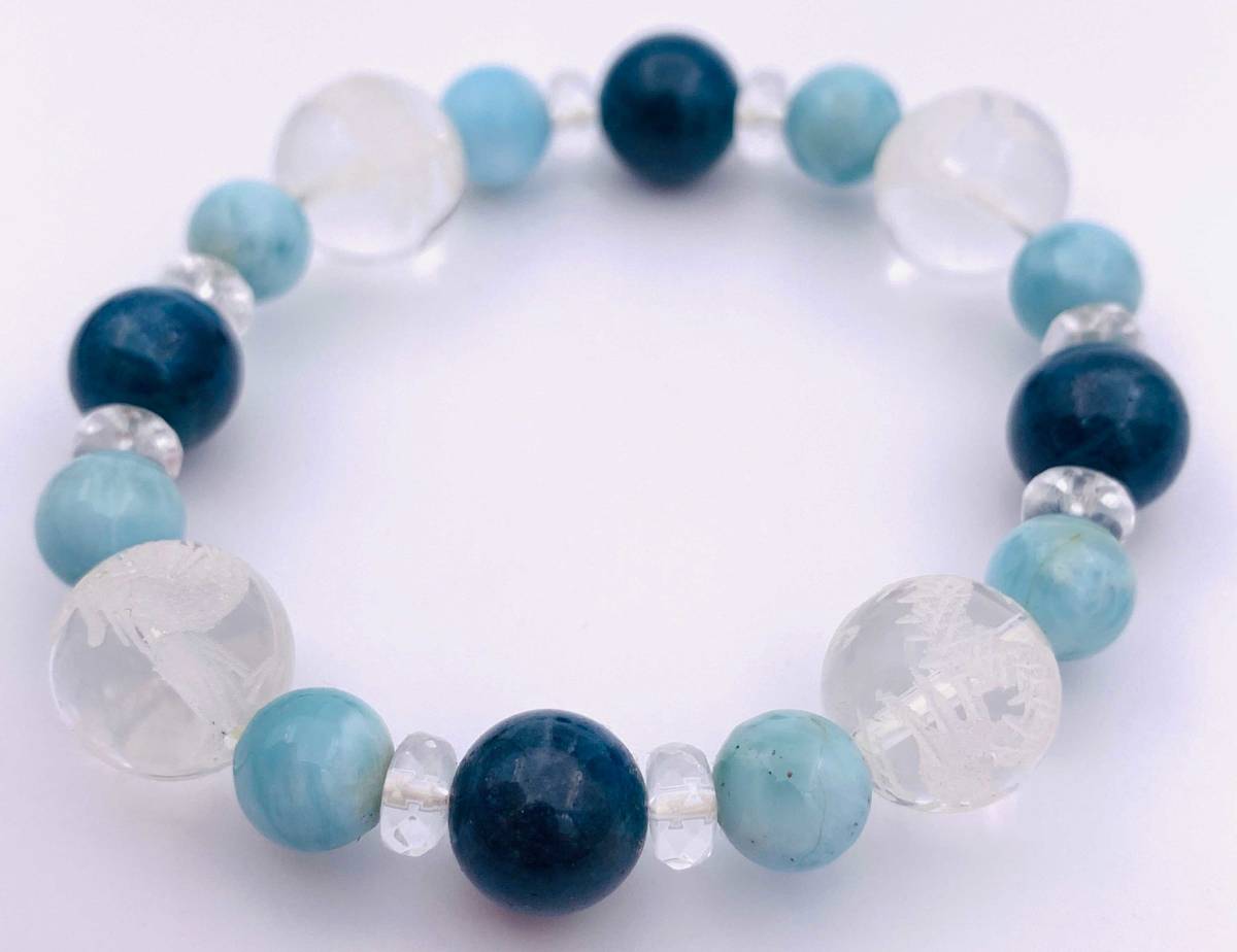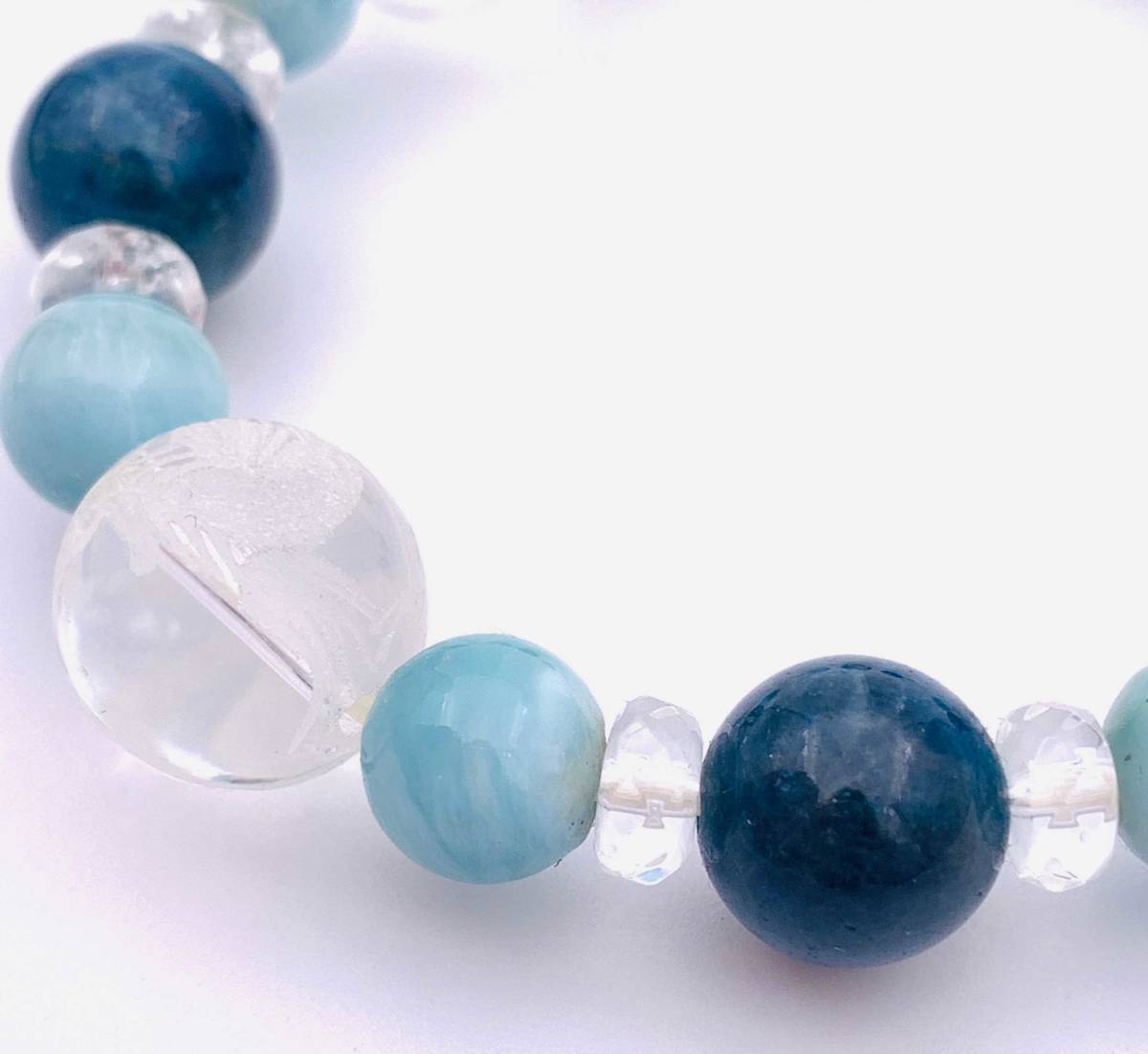 風水四神!天然石彫り水晶12mm玉&ラリマー&アパタイトのブレスレット