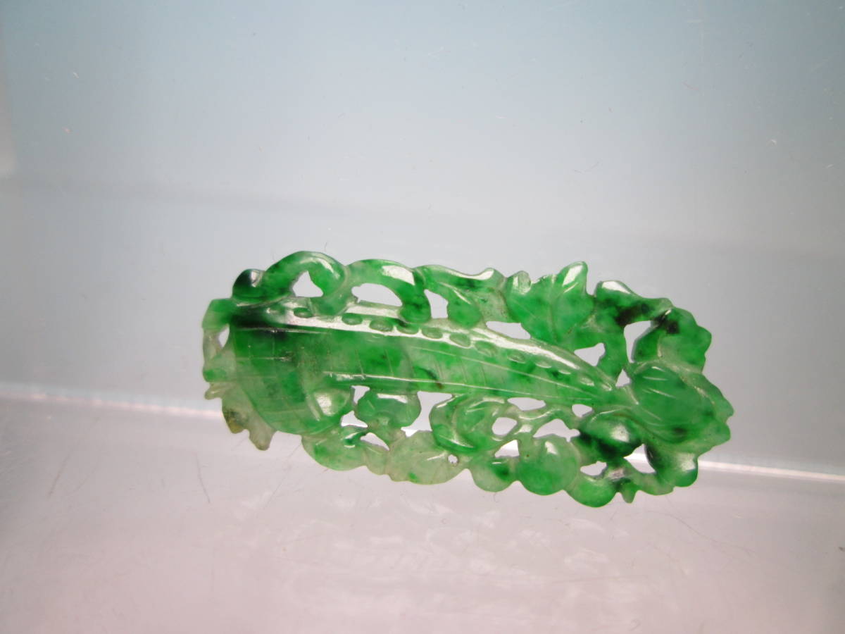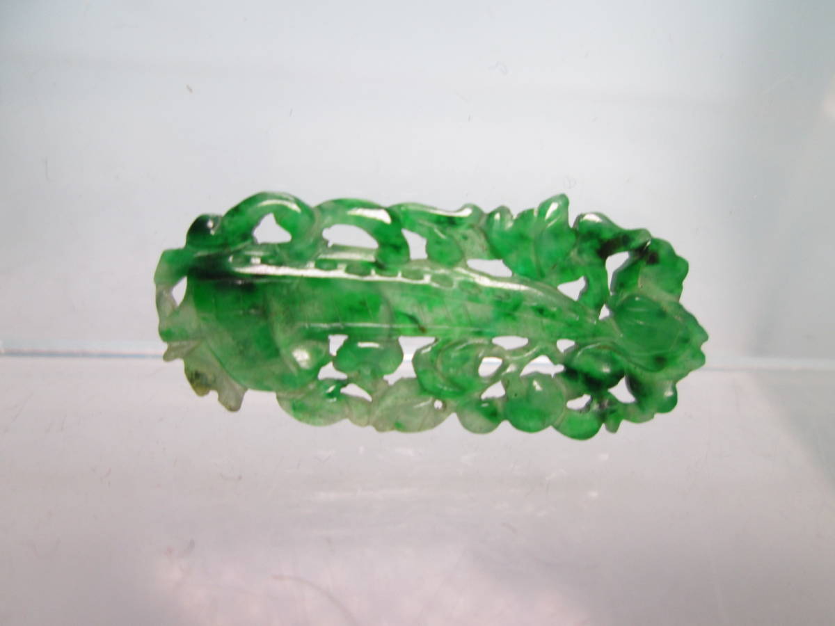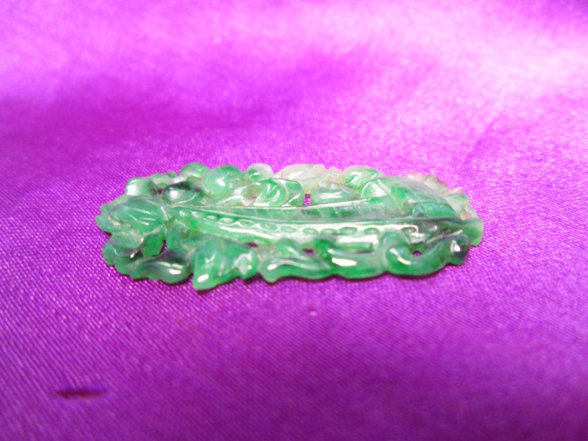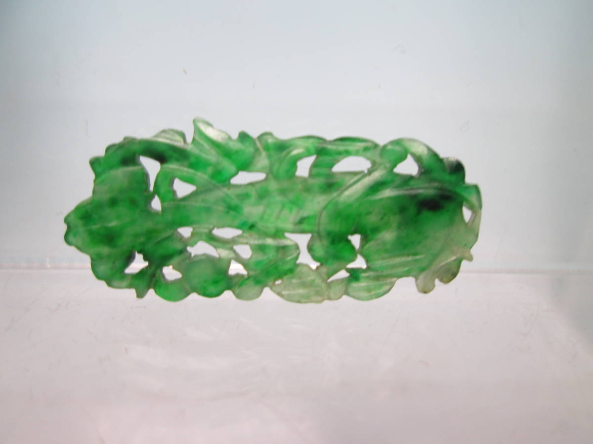 【江月】アンティーク・本翡翠 花に舟透かし両面彫刻の彫物 1,34g 紫布付
