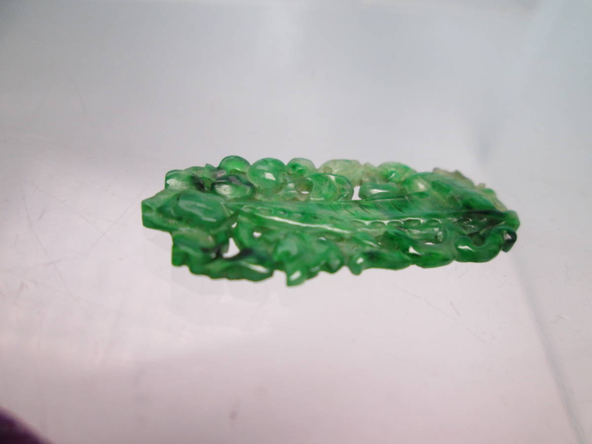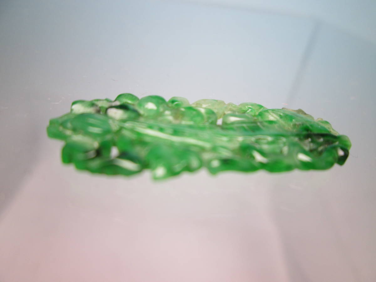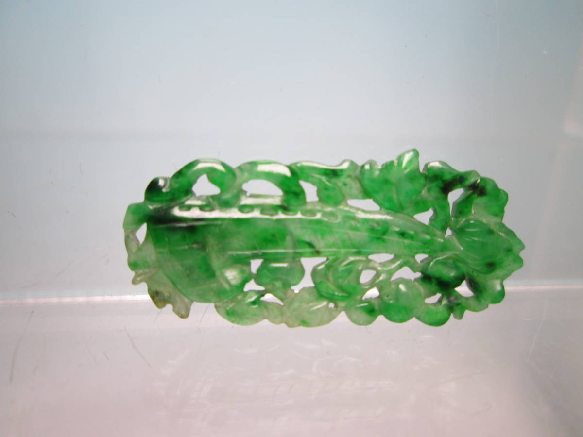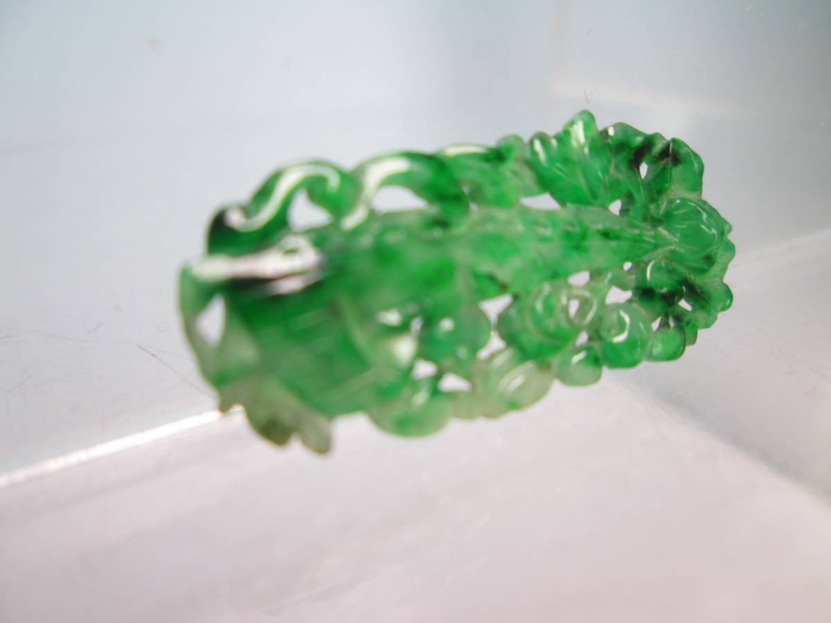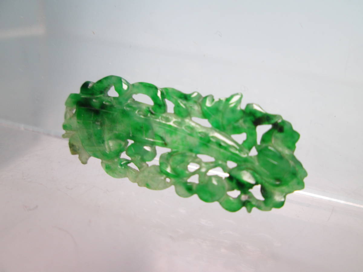 【江月】アンティーク・本翡翠 花に舟透かし両面彫刻の彫物 1,34g 紫布付