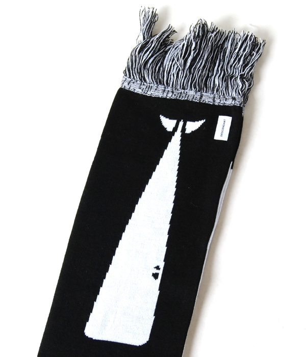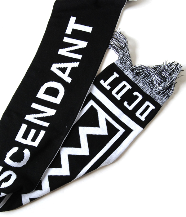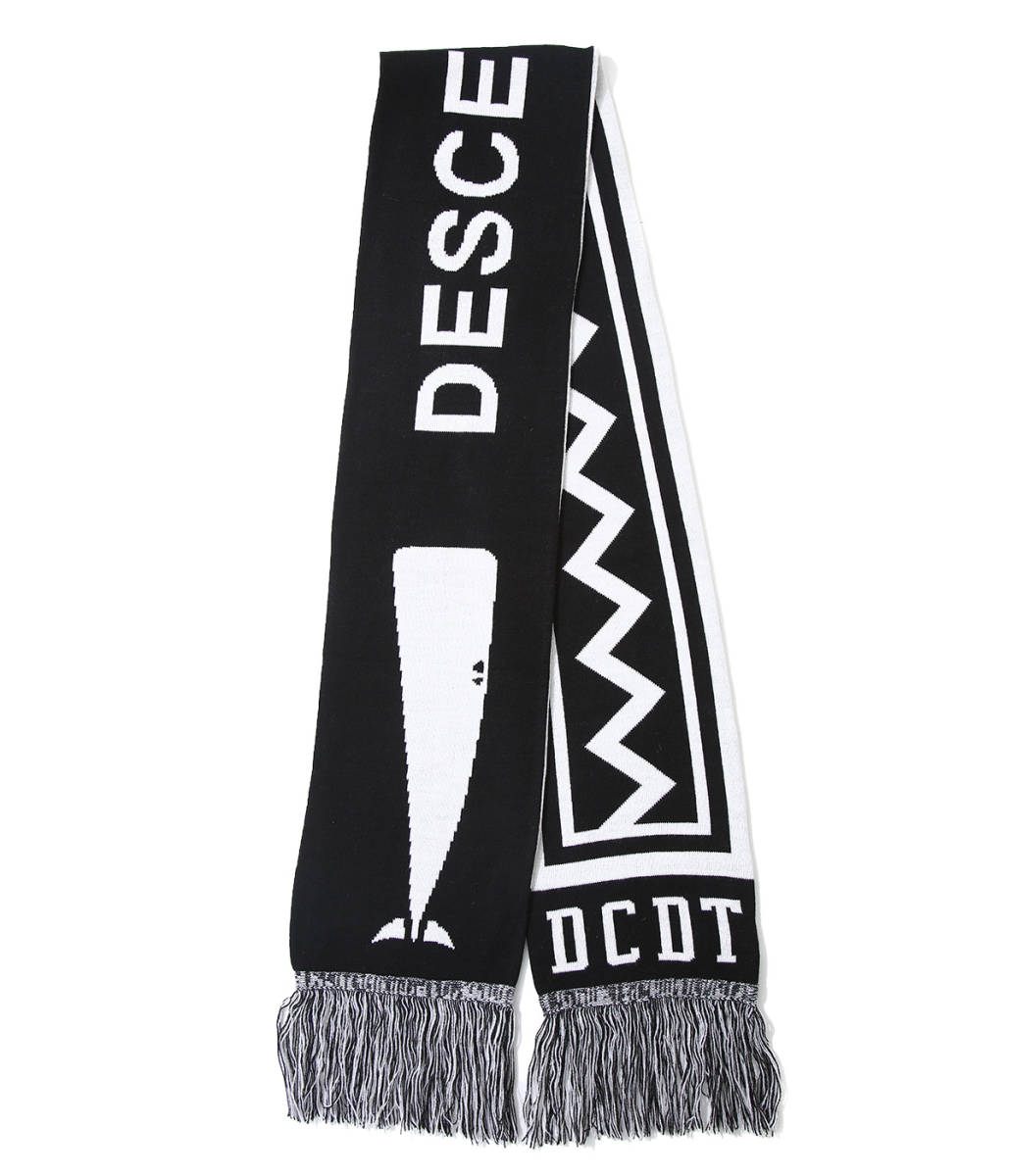 ジグザグの幾何学模様の裏面に、DESCENDANTとクジラのロゴを編み込んだジャカード仕立てのフリンジ付きマフラー。