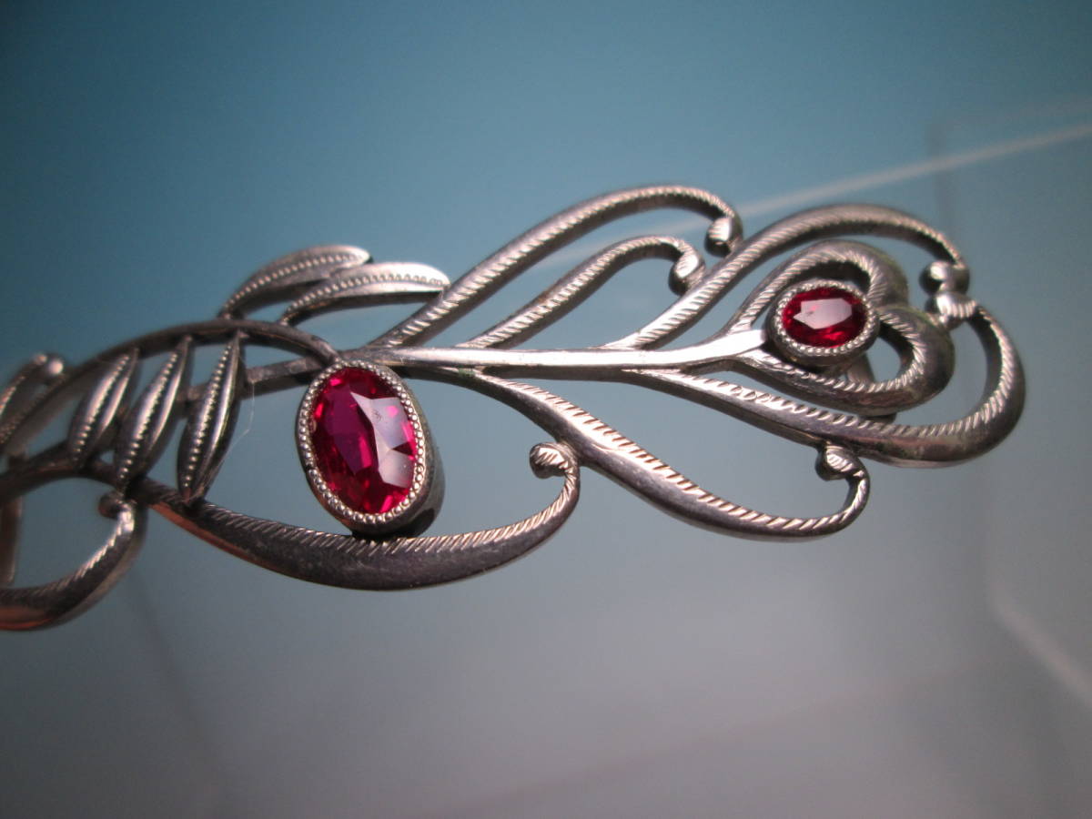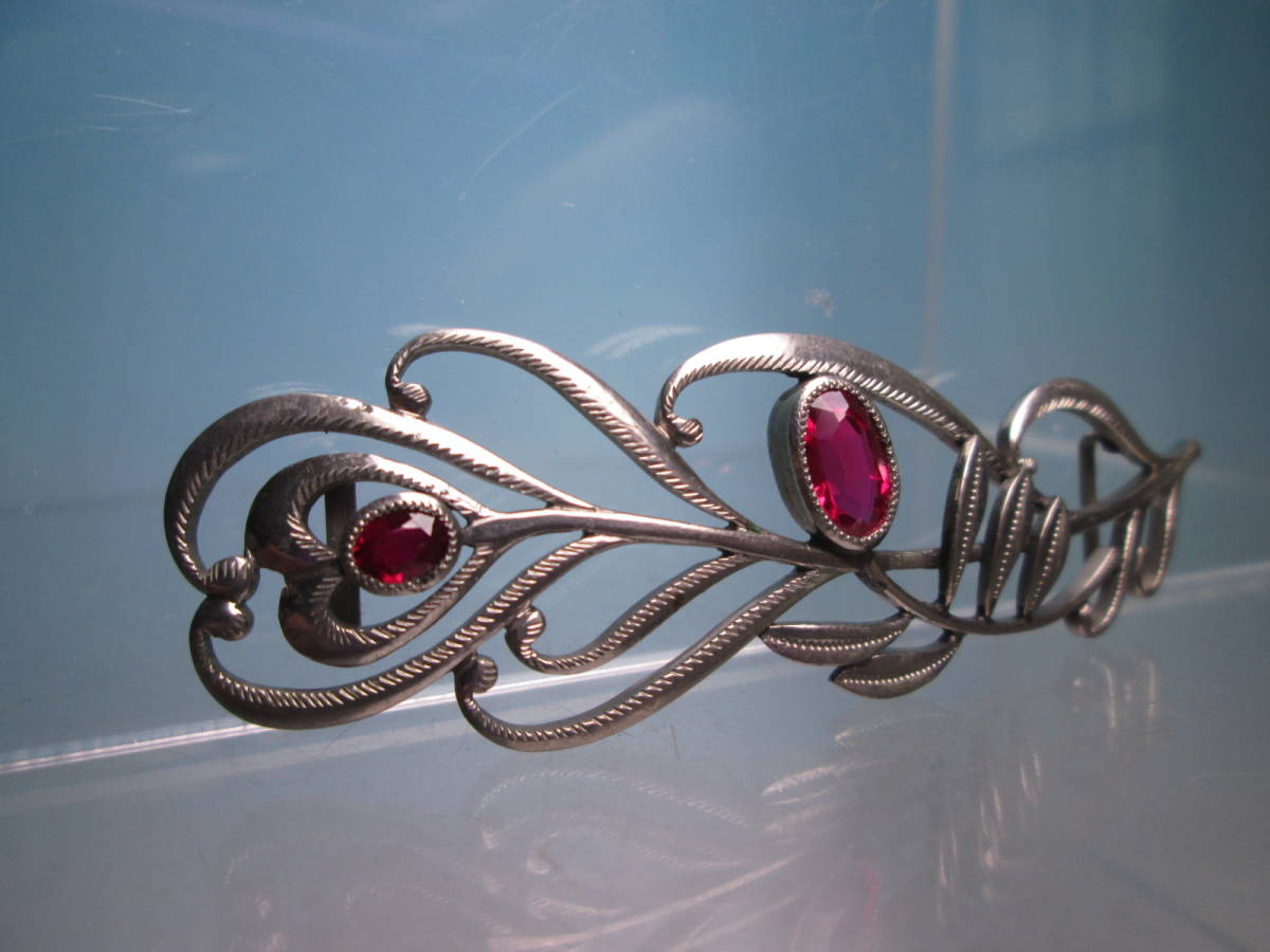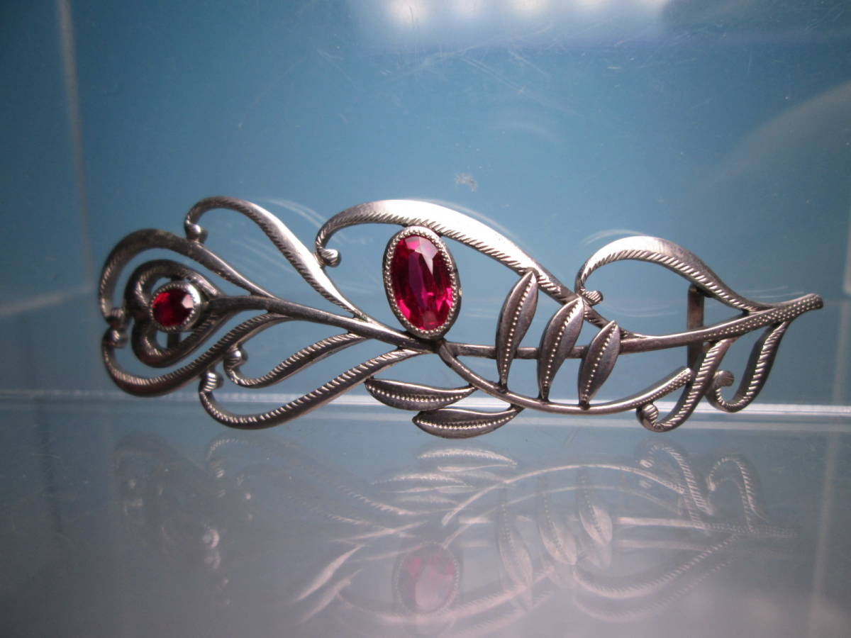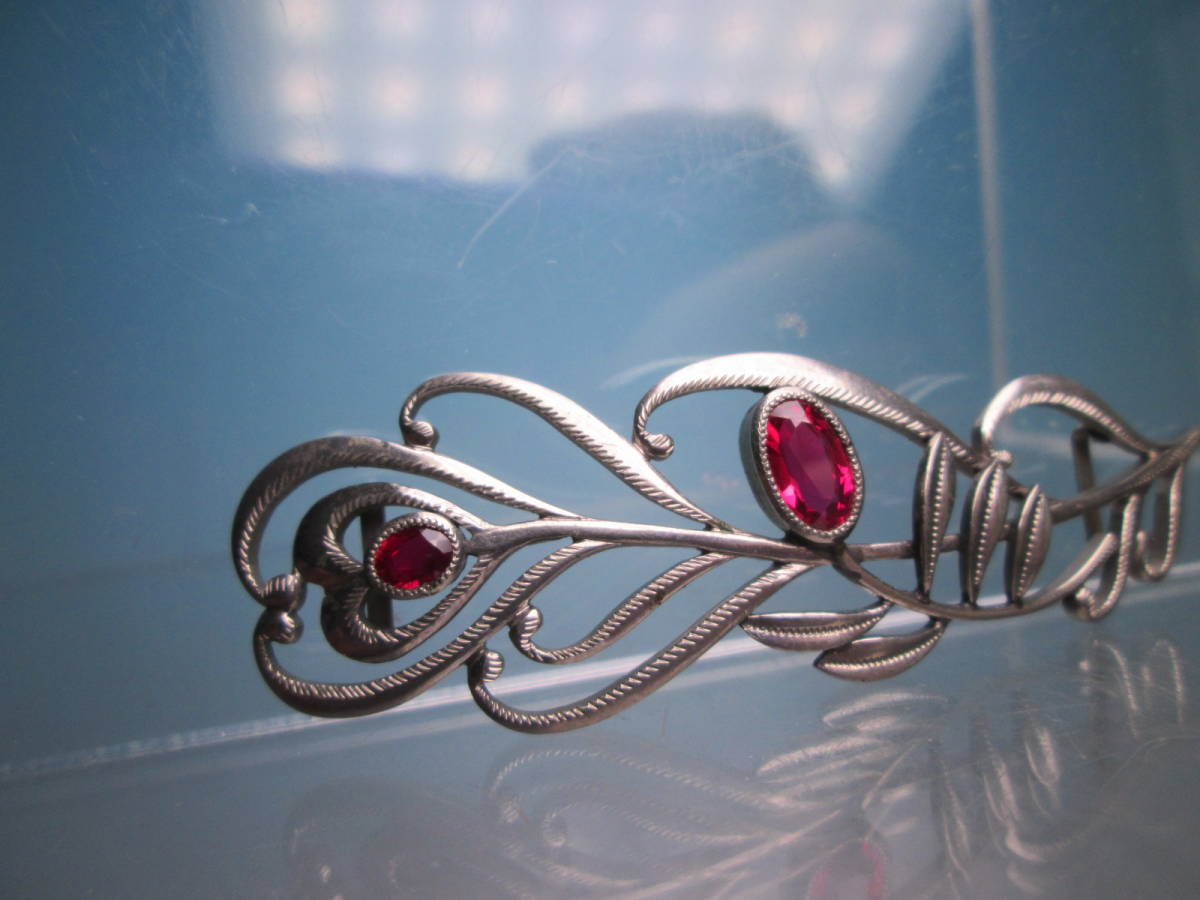 【江月】アンティーク・彫金細工 大振り 7cm 赤硝子花と孔雀の帯留め 7,9g