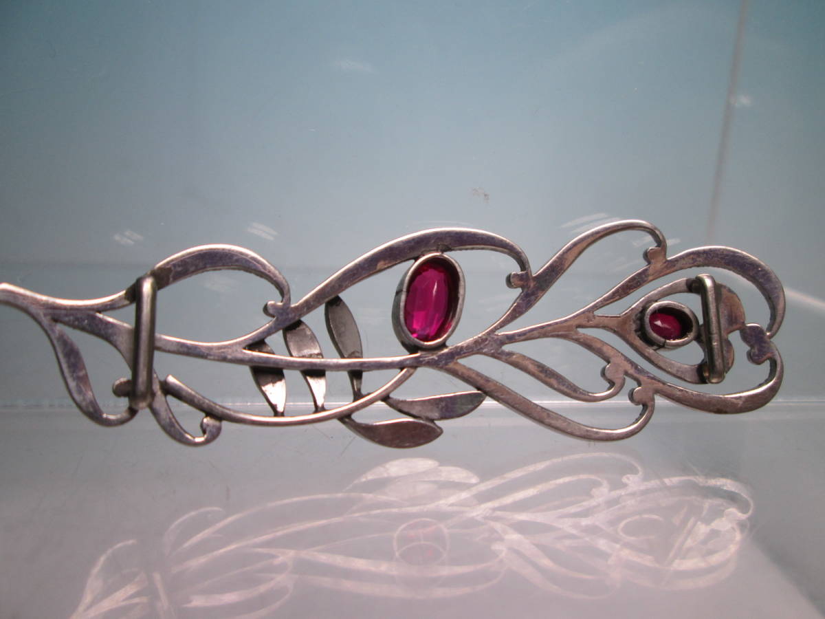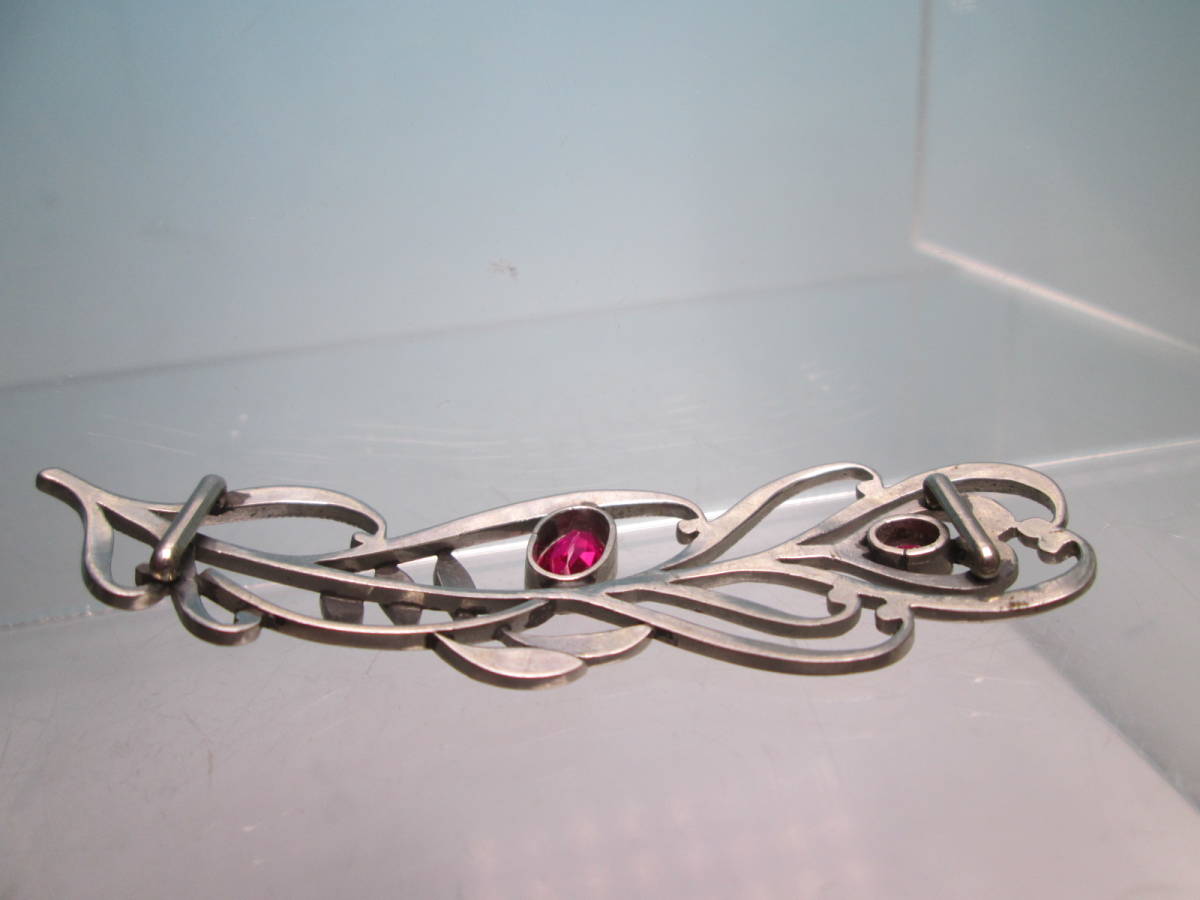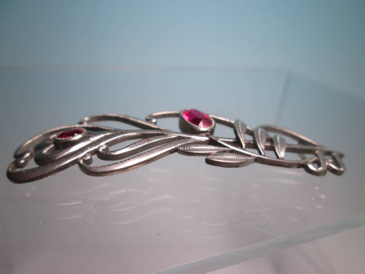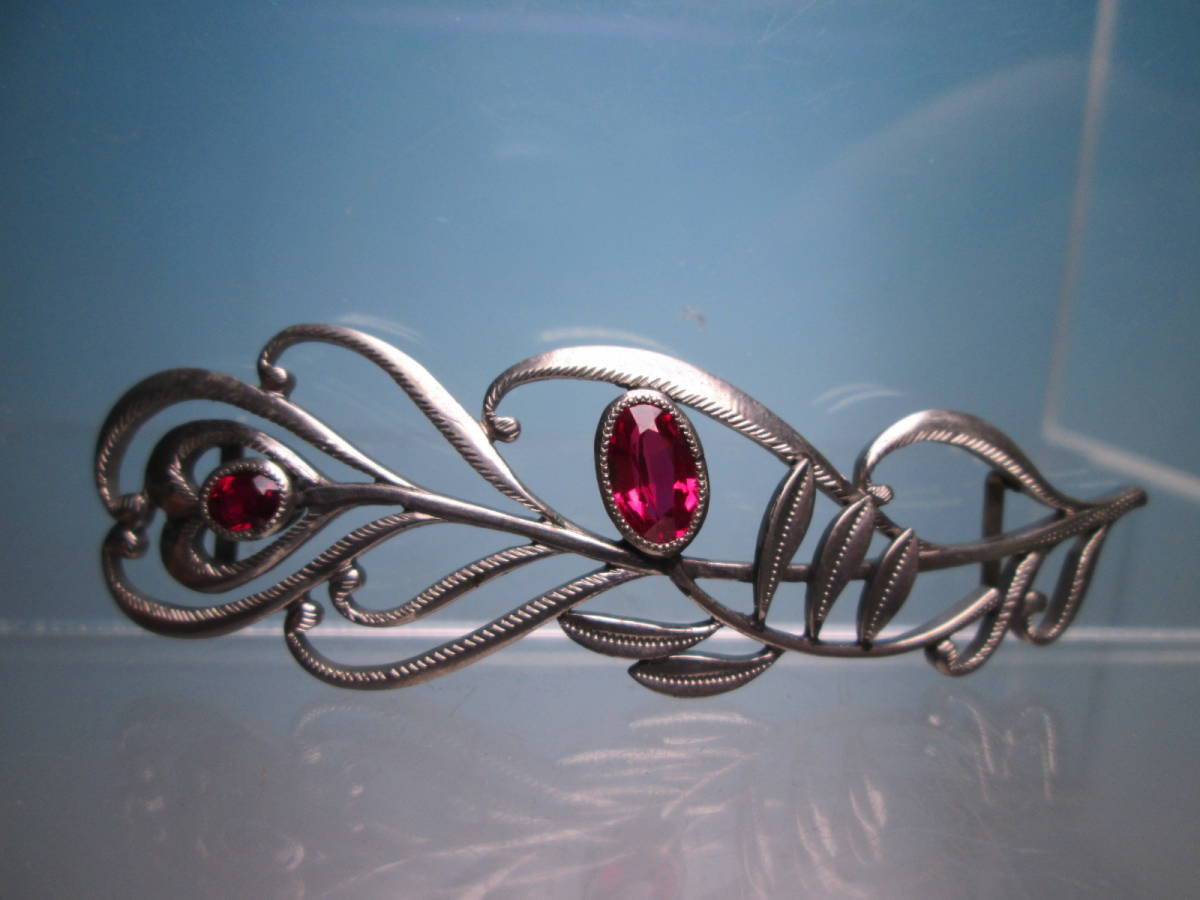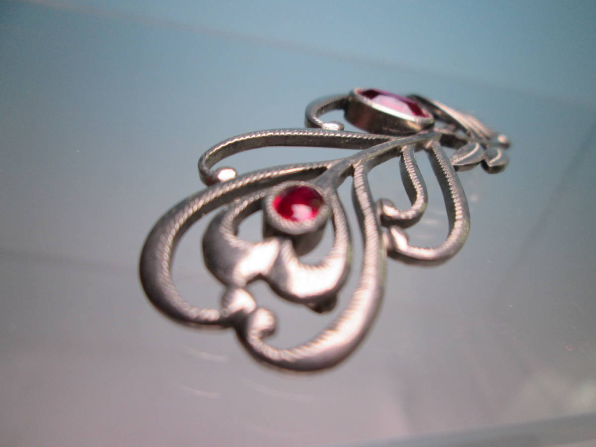 【江月】アンティーク・彫金細工 大振り 7cm 赤硝子花と孔雀の帯留め 7,9g