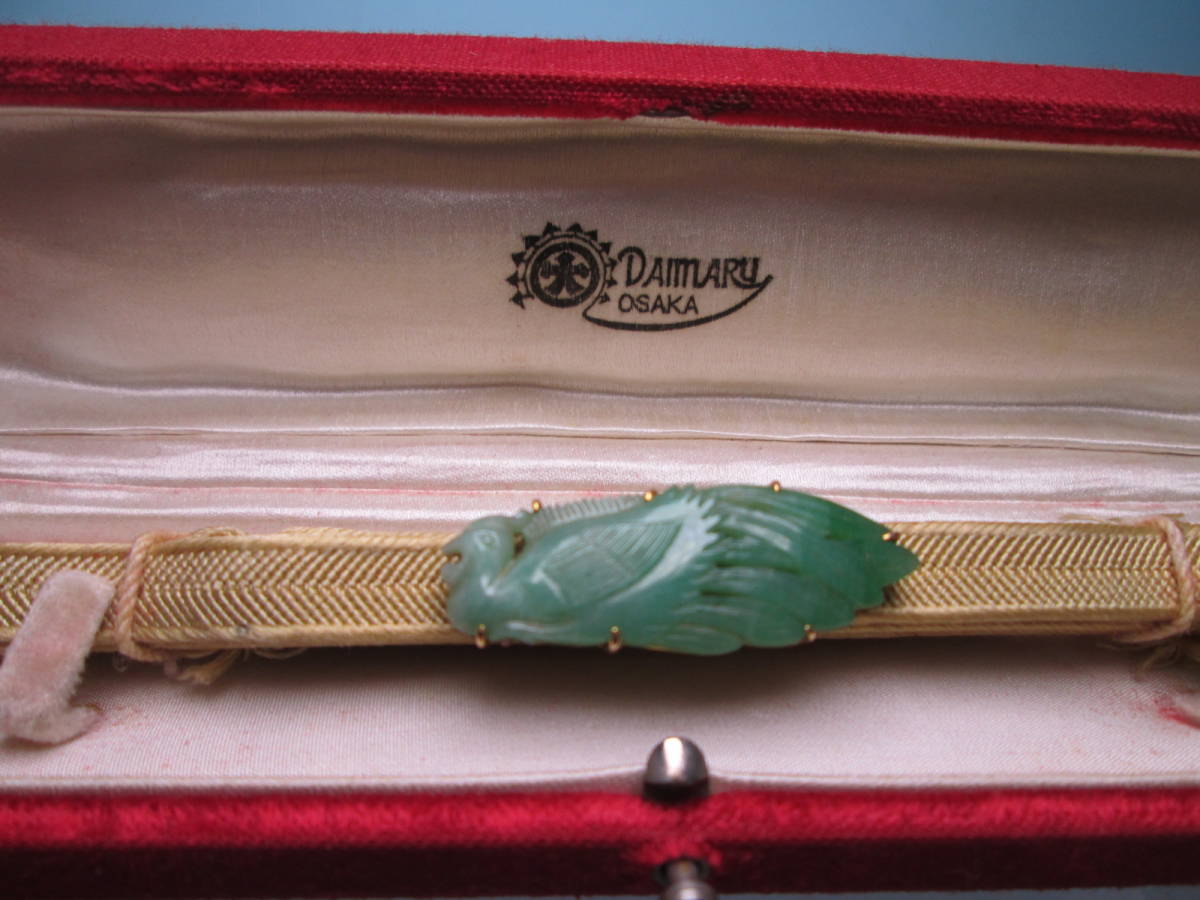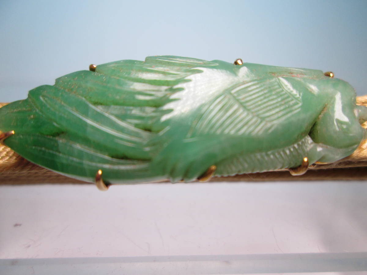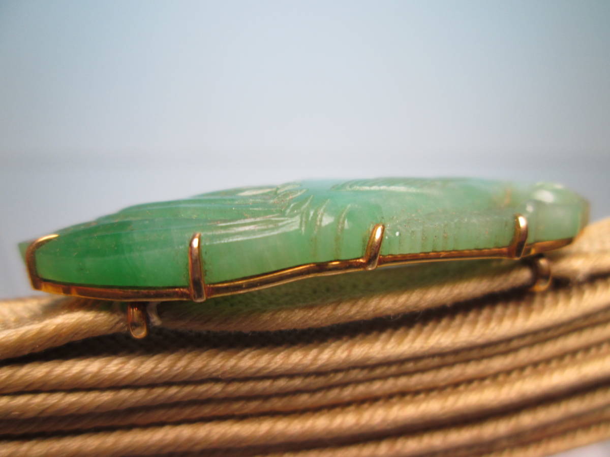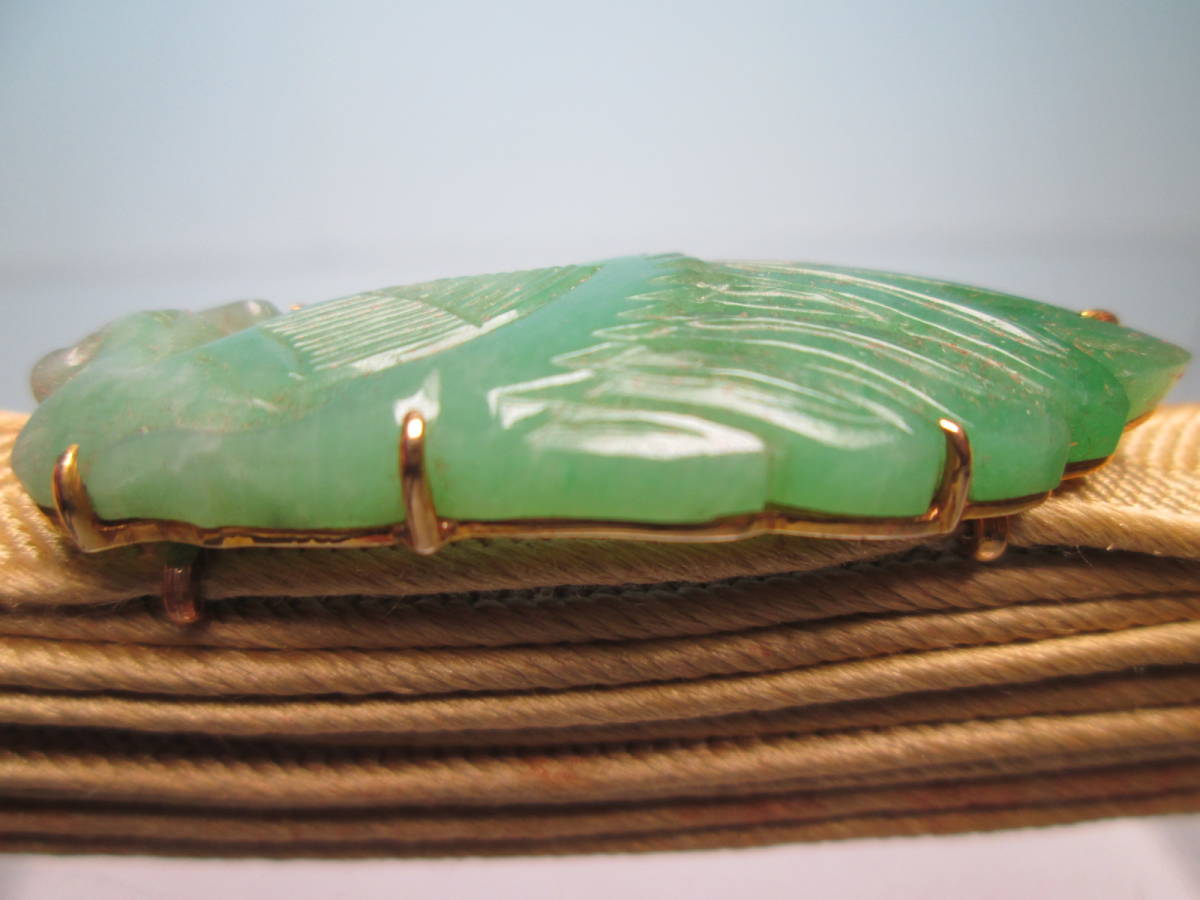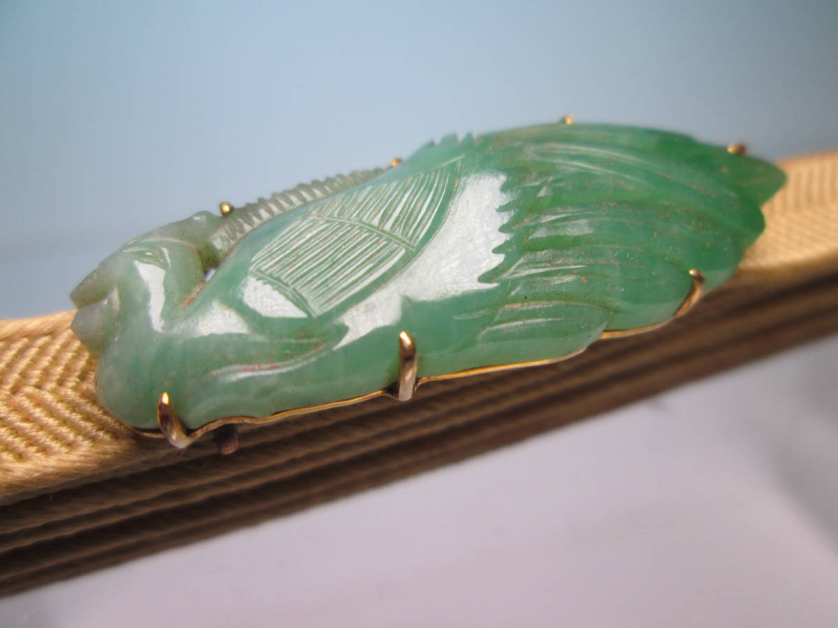 【江月】アンティーク・大丸 K18 本翡翠 孔雀彫刻の帯留め 共ケース付