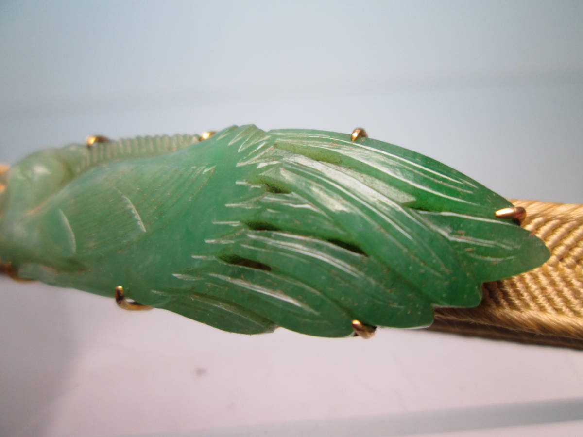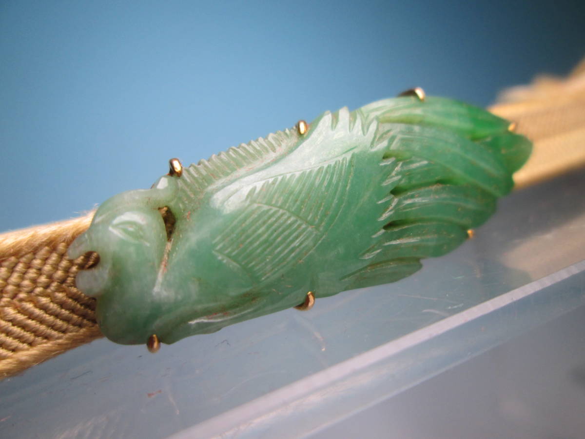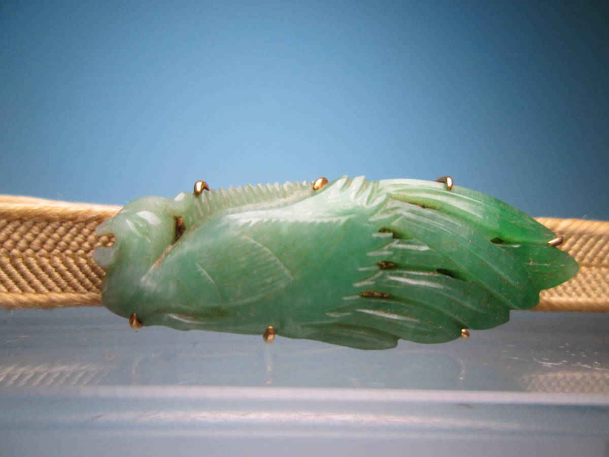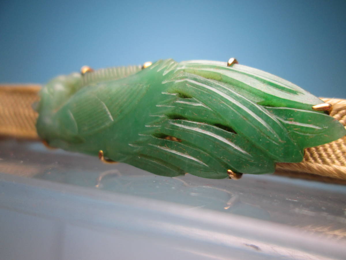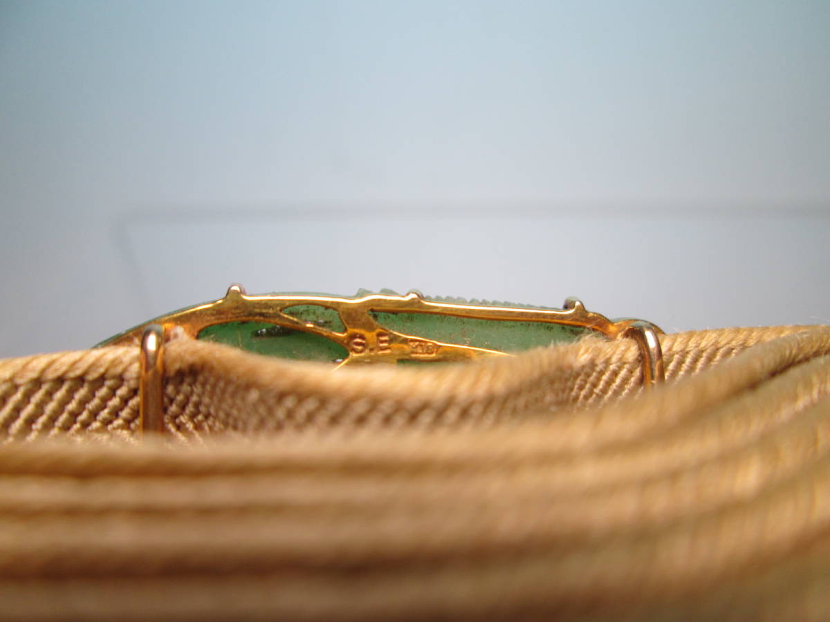 【江月】アンティーク・大丸 K18 本翡翠 孔雀彫刻の帯留め 共ケース付