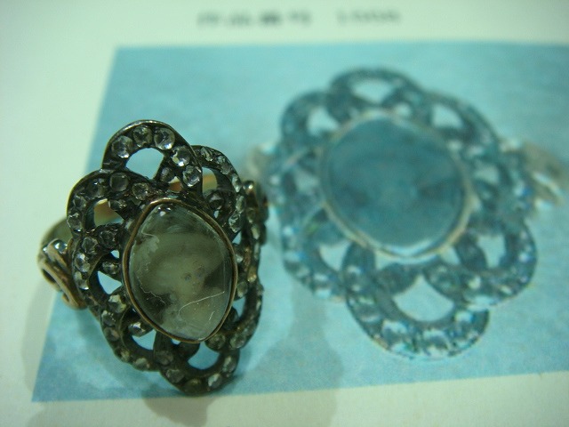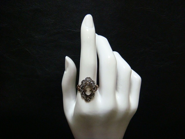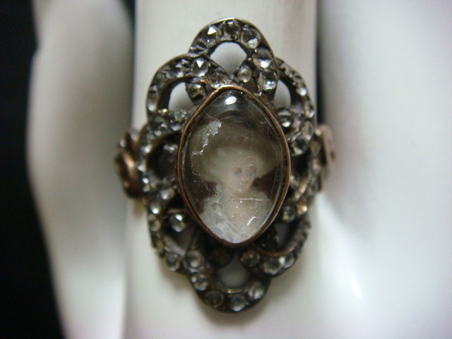 | ご覧頂きましてありがとうございます! アンティーク ミニアチュールリングです。サイズは約13です。リング部分は金ですが含有率は不明です。 レース部分の模様部分はシルバーと思われます。 1860年代のフランス製と思われる鷲の刻印がリング部分にあります。 当時に流行したと思われる幅の広いつばの帽子をかぶった女性が描かれています。 当時の貴族の肖像画と思われます。 リングにある石はダイヤではありません。ホワイトサファイヤかクリスタル系だと思われます。 150年前の貴族の女性が身に着けたリングをはめて当時にタイムスリップしてみませんか? 当時の貴族の気持ちになって心の余裕が出てくることでしょう? 世界でたったひとつのアンティークジュエリーにご理解のある方のご入札お願いいたします。 新品のケースに入れてお届けいたします。 追加画像がありますのでパソコンでご確認ください。 宝石との出会いは一期一会です。『いいな』と思ったら是非、身につけてあげて下さい。きっと宝石も喜ぶことでしょう! 宝石は決して貴女を裏切りません。身につけた貴女を守ってくれることでしょう。 いつも頑張っている自分へのご褒美にいかがでしょうか? 良いものをひとつお持ち下さい。一生物のジュエリーとなります。 画像での判断は難しいと思いますが、落札後の返品、クレーム等の無きよう、ご自分の自己責任においてご入札下さい。 モニター、パソコン、カメラによって色や感じ方が変わりますのでご注意下さい。 商品についてはコレクター、質屋さん、お客様の委託品が中心ですので、ご質問の答えが遅くなる事がありますがご了承下さい。 商品説明につきましてはすべてをお知らせできませんので、質問にてお願いいたします。 基本的にはUSED品ですので、その点を十分にご理解の上ご入札下さい。 途中で出品を取り下げる場合もありますがご了承下さい。 尚、トラブル回避の為、申し訳ございませんが、新規の方及び評価によってはこちらで入札を削除させていただく場合もございますが、ご理解下さい。 メールの確認は夜になりますのでご連絡が遅くなることもありますがご了承願います。 品物にも人と同じように『こころ』があると思います。喜んでいただけることが私にとっても品物にとっても一番良いことだと思います。 『落札したけど気に入らなかった』ということが無いように十分にお考えになってからご入札下さい。 発送は宅配便を予定しております。また発送には2,3日かかる場合もございますが、ご了承願います。 お互いに気持ちよい取引のため、落札後3日以内のご連絡、5日以内のご入金頂けない場合は申し訳ございませんが取り消しさせていただきます。 落札金額より僅かですが『子ども虐待防止 オレンジリボン運動』へ寄付をさせていただきますがご了承お願いいたします。 | |
