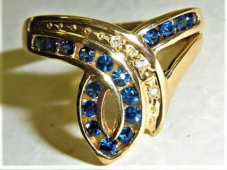 綺麗なサファイヤ17ヶに3ヶのダイヤが輝いています。