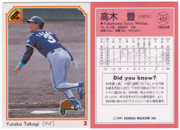 BBM91オールスターカード#434須藤豊、#439野村弘樹、#455高木豊の大洋チームコンプリートセット全3枚です。