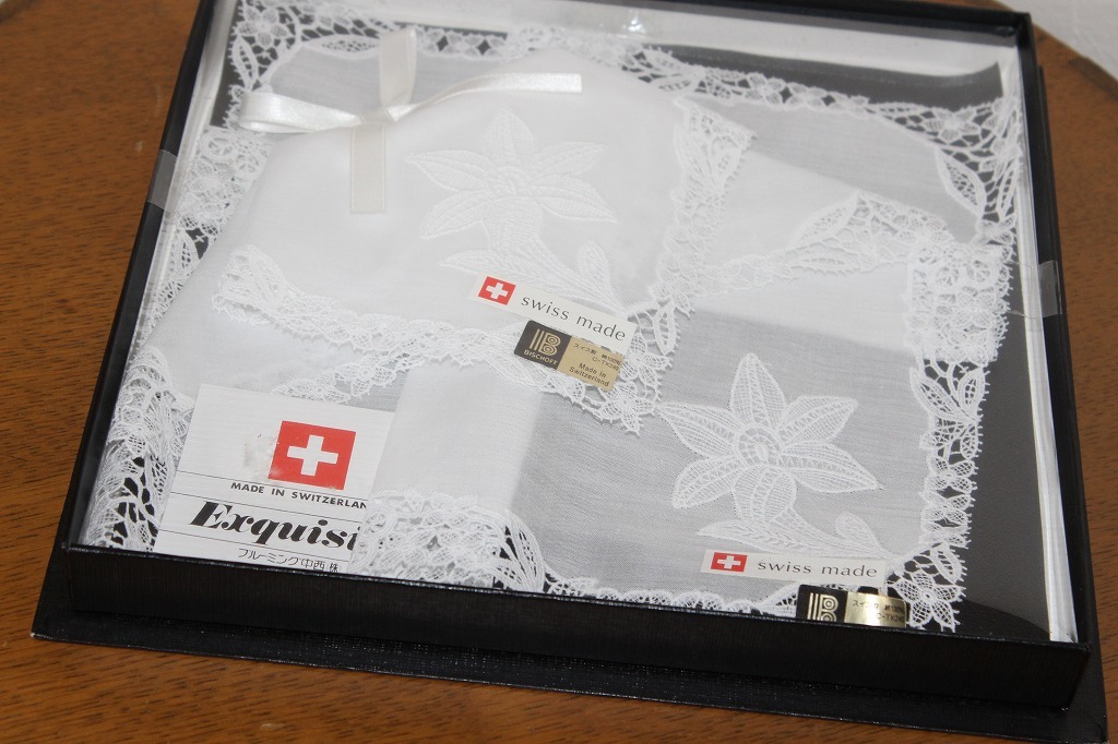 BISCHOFF社 レースハンカチ 2枚 新品 size/29cm角 スイス製 qua/綿100% 素敵なお品です。お好きな方に。 画像判断となります。神経質な方はご遠慮ください |