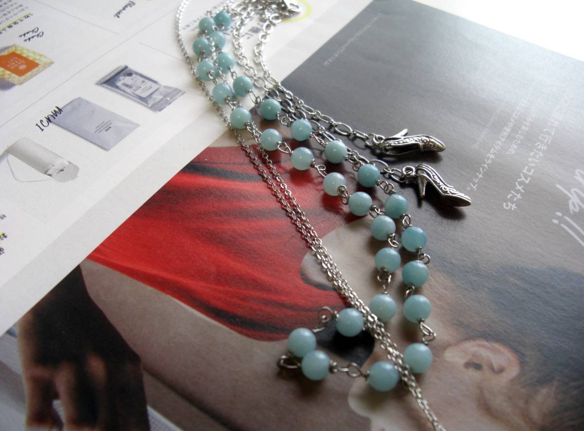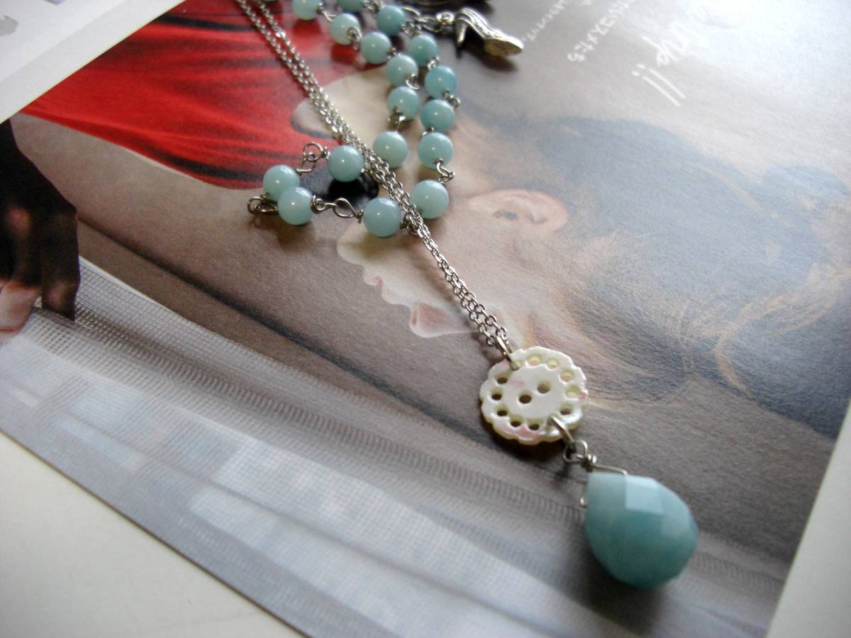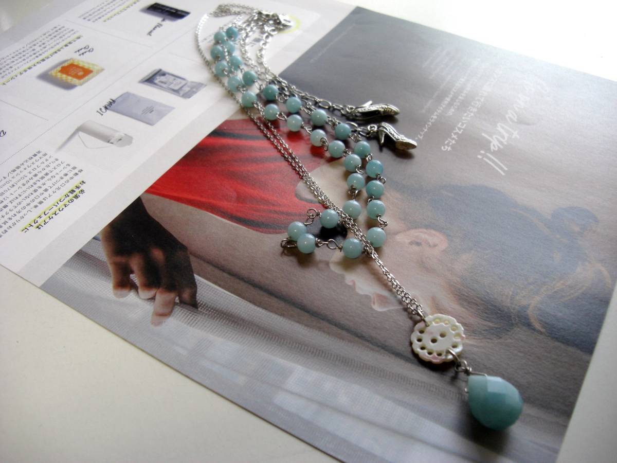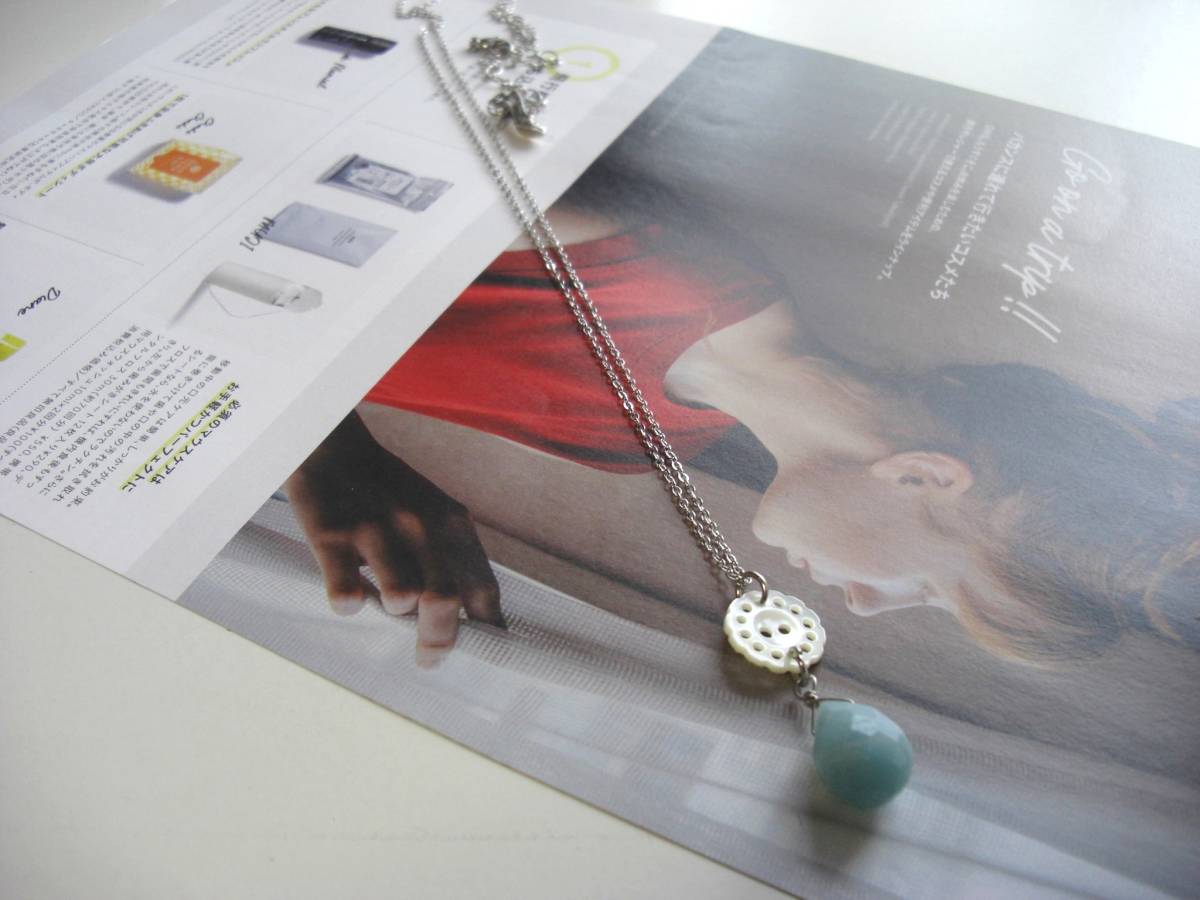 初夏の色を+して・・シリーズです♪可憐なレースと水色・・神秘的なアマゾナイトのネックレスです♪デザイン違いの2点セットです♪重ねても単品で使われても素敵です♪6ミリのアマゾナイトを紡いだネックレスは長さ62センチ位です♪チョーカー風にしたりブレスレットにしても可憐な表情です♪15ミリ位のシェルのレースボタンと18ミリ×13ミリのドロップカットのアマゾナイトのネックレスは華奢なチェーンを合わせました♪長さは70センチ+アジャスター10センチで最長80センチ位です♪トップは4・3センチ位です♪それぞれ単品やブレスレット、イヤリングも出品しています♪♪シンプルで飽きのこないいつまでも着けられるデザインを考えて作りました♪ハンドメイドをご理解頂いてノークレー ム、ノーリターンでお願いします