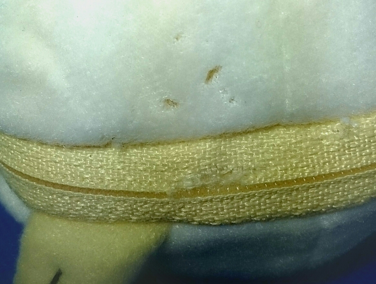 撮影のため自宅クリーニング済みですが、長期保管品ですので、経年劣化による細かな黒ずみや黄ばみ、接着剤の変色、肌の毛羽立ち、糸のほつれ、虫食いによる穴が多少見られます。