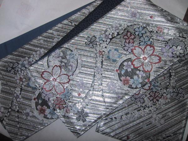 なお、帯柄左上に無地で出ているところは裏無地で、柄と柄の間に出ているところは手先と前太鼓のあいだの無地部分です。六通柄です。金銀糸が多用されているためストロボの照りで、しろぽく写っている部分があります。