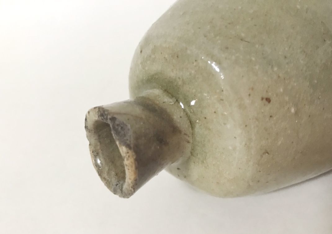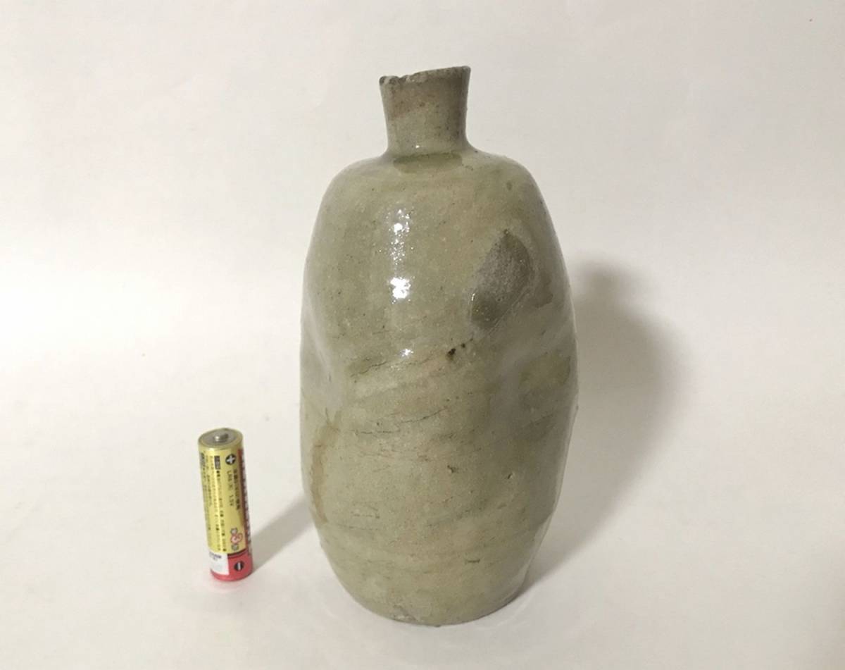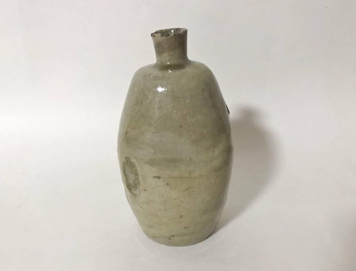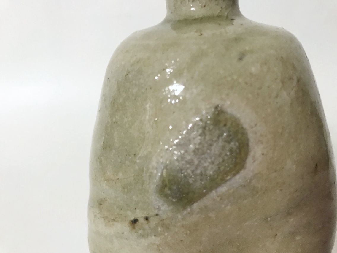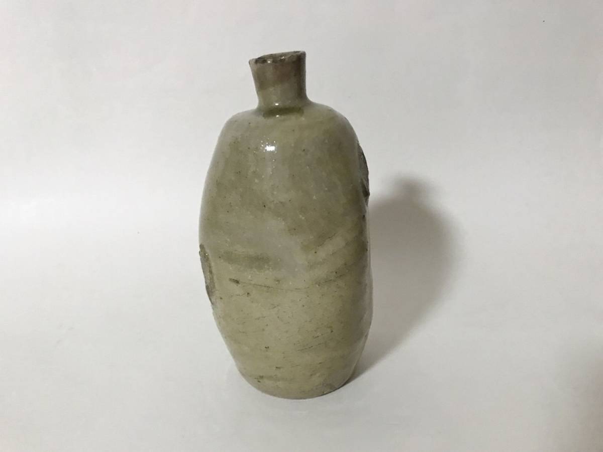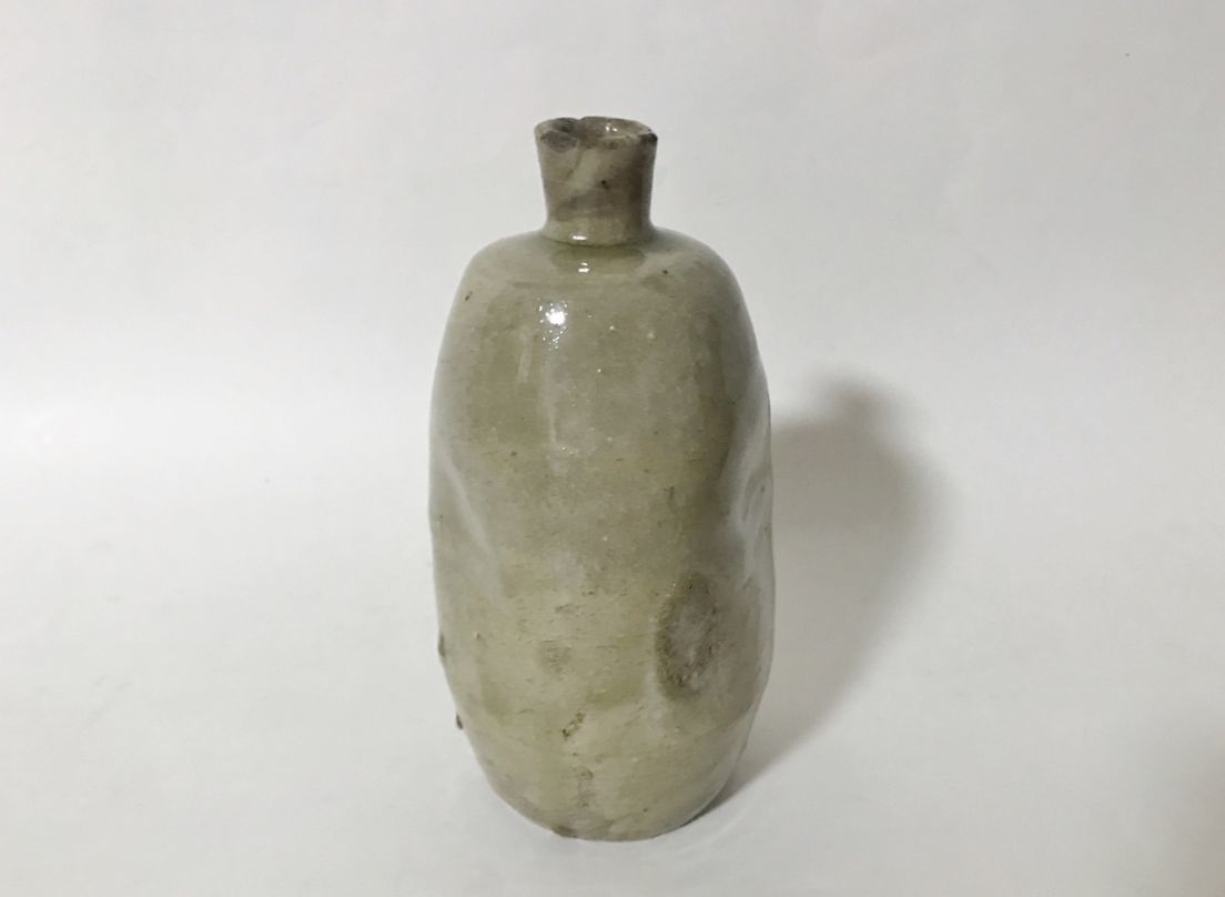 緑掛かった釉薬(瀬戸釉)が厚くかかりいびつな姿の徳利です