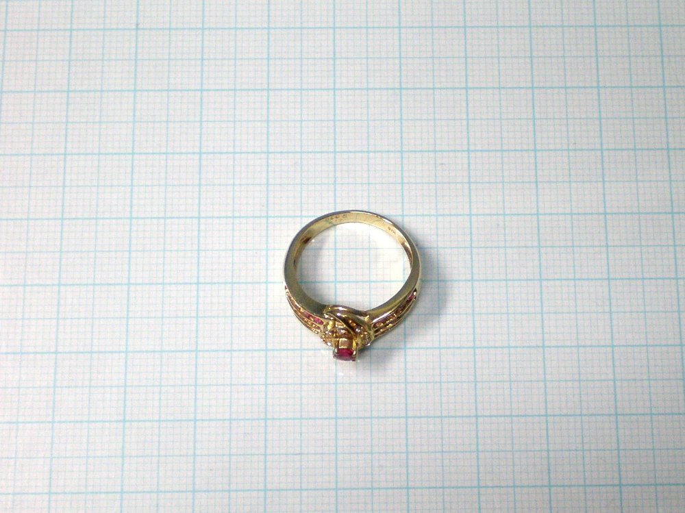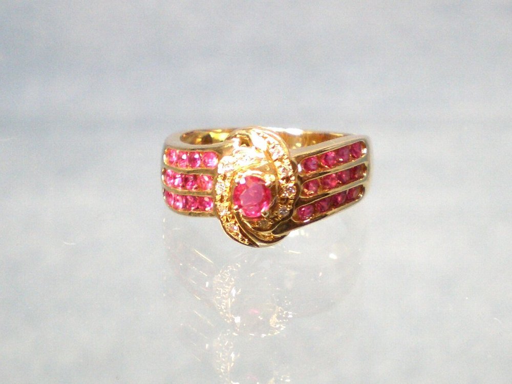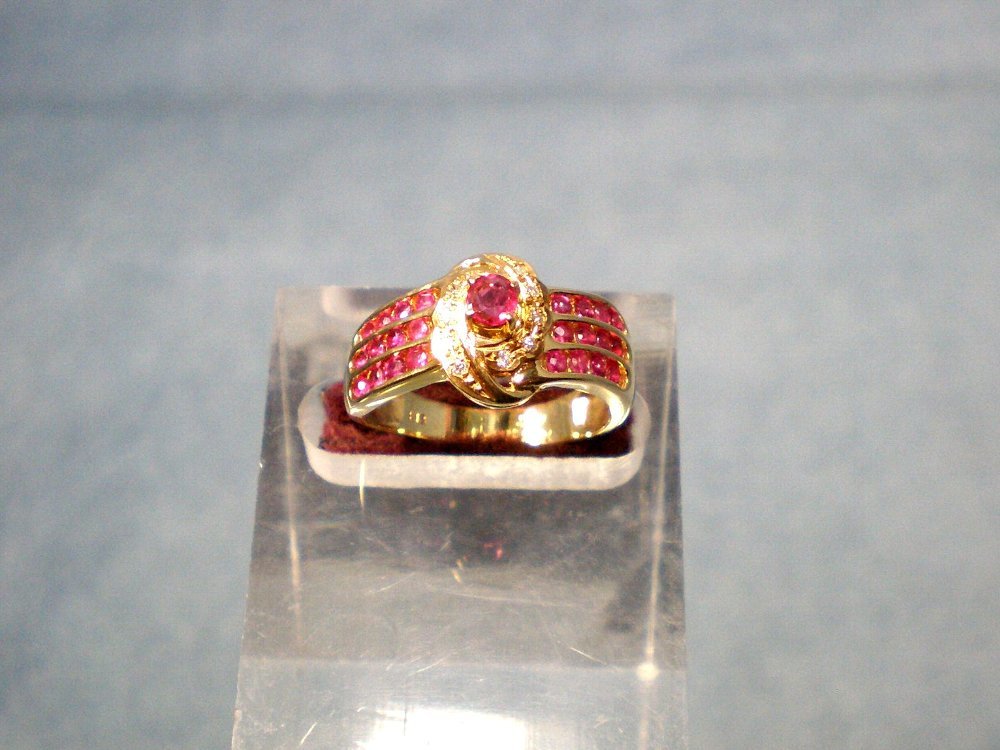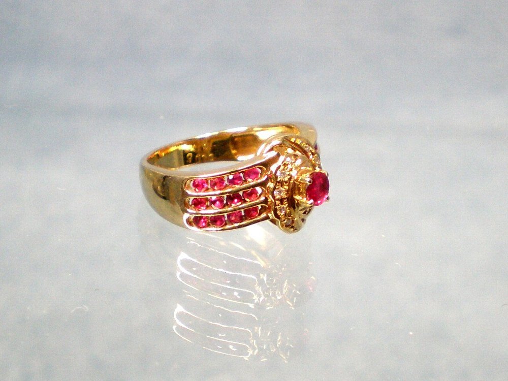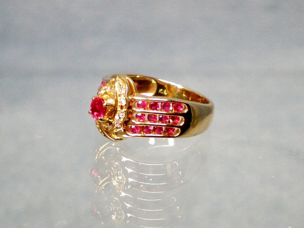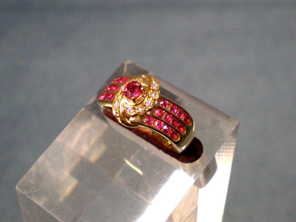センターにルビー(0.17crt)その周りにダイヤモンド10個(合計0.05crt)が取り囲み両サイドに3列4個ずつ合計24個のルビーがデザインされています、総重量4.4g、リングサイズは11号です。