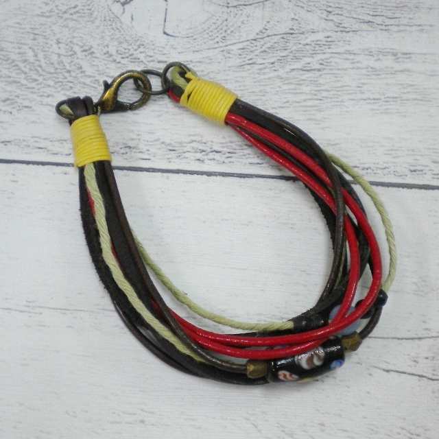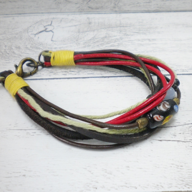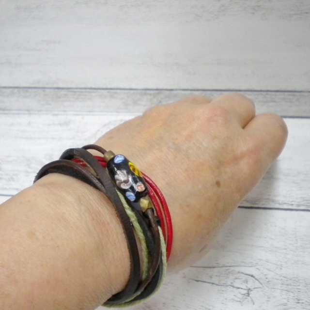 牛革ひも2本、牛革丸紐2本、ワックスコード太、細、各2本合計8本とビーズなどで製作したラップブレスです。