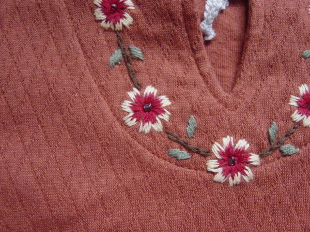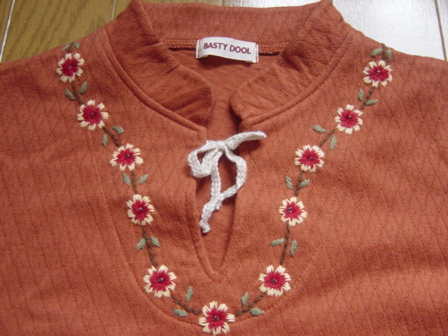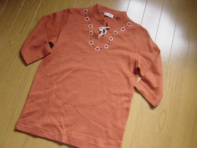 M★首まわり花柄刺繍入り五分袖オレンジブラウンカットソー