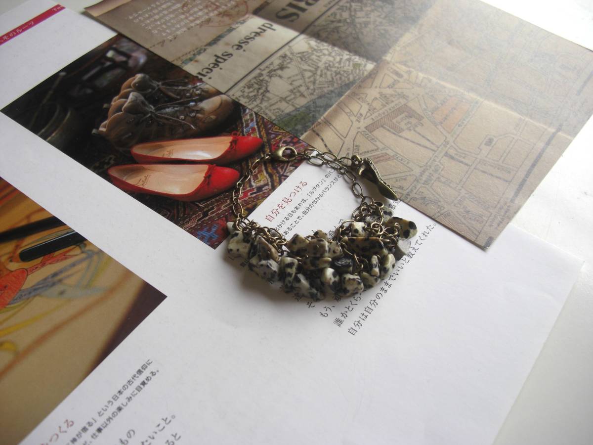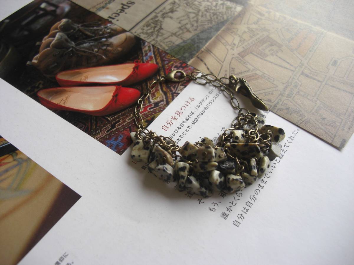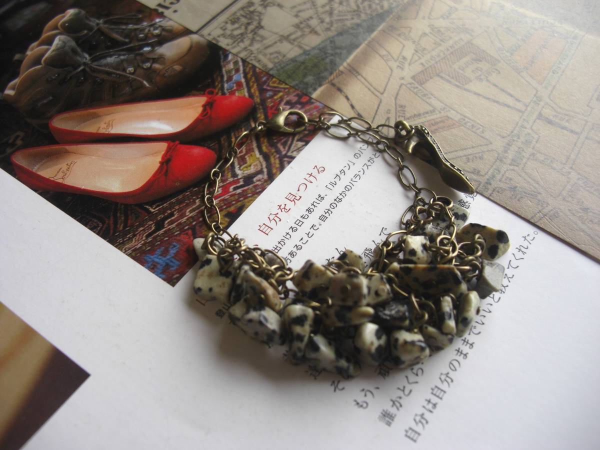 大人のあどけなさ・・シリーズです♪キュートなダルメシアン・・個性的なダルメシアンジャスパーのブレスレットです♪6ミリから9ミリ位までのさざれのダル メシアンを2連のチェーンに繋いでシックな表情です♪長さは全長22センチ位で調節自由です♪ダルメシアンの部分は8センチ位です♪お揃いのネックレスやリングも出品しています♪シンプルで飽きのこないいつまでも着けられるデザインを考えて作りました!ハンドメイ ドをご理解頂いてノークレーム、ノーリターンでお願いします