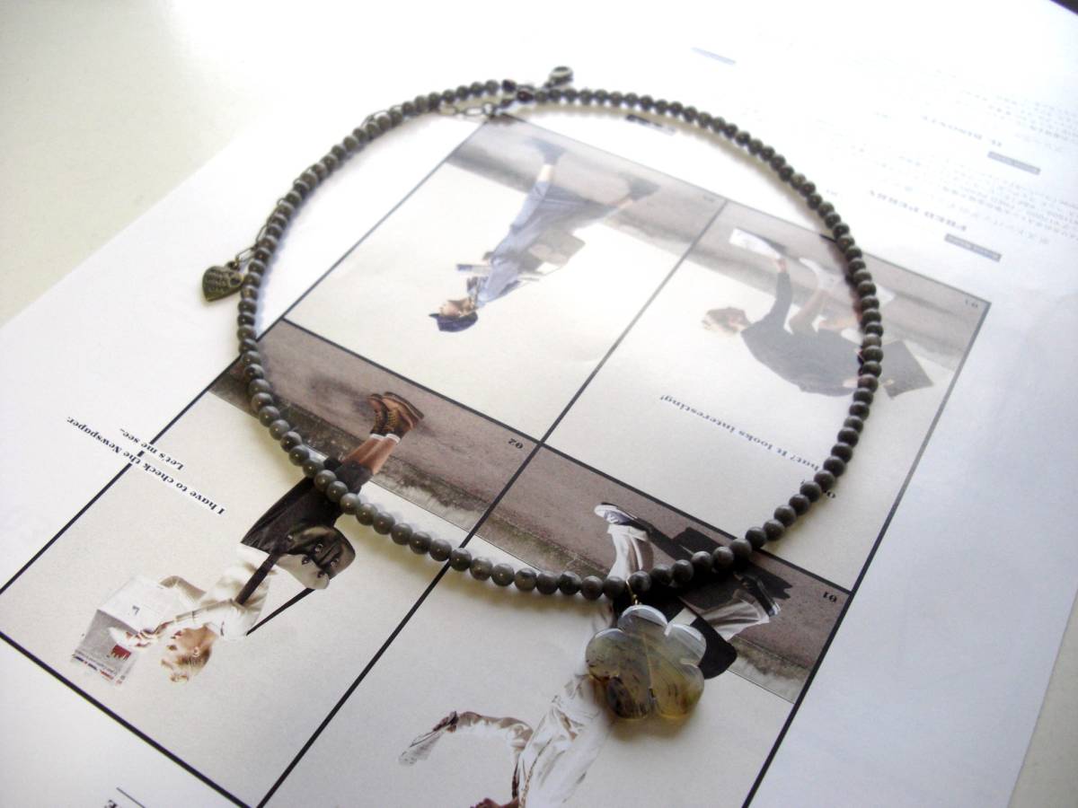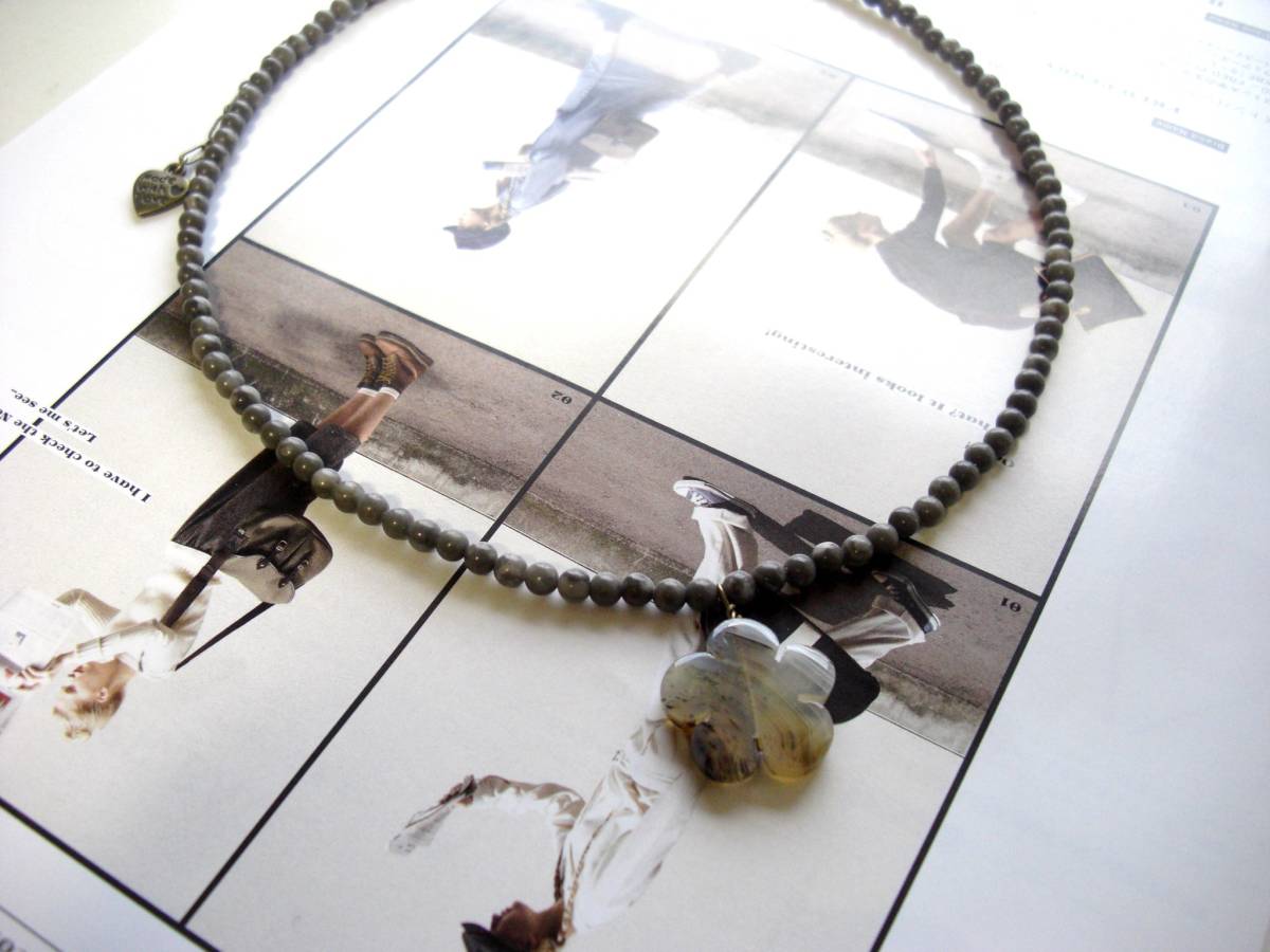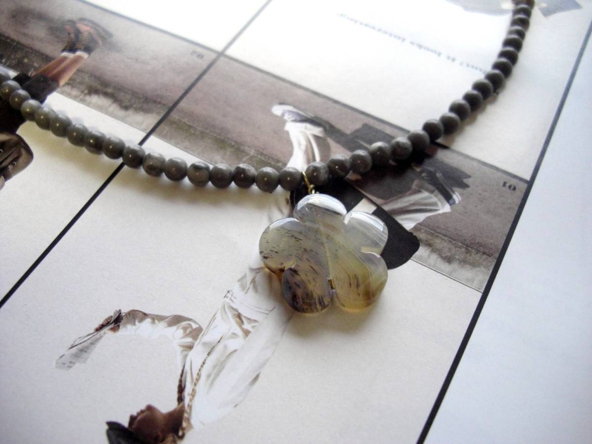 愛らしさを繋いで・・シリーズです♪シックなお花・・大人色のグレーオニキスのネックレスです♪神秘的なモンタナアゲートのお花を合わせて可憐な表情です♪グレーオニキスは小粒の丸玉、モンタナアゲートのお花は20ミリ位です♪長さは45センチ+アジャスター10センチで最長55センチ位です♪お揃いのブレスレットも出品しています♪シンプルで飽きのこないいつまでも着けられるデザインを考えて作りました!ハンドメイドをご理解頂いてノーク レーム、ノーリターンでお願いします