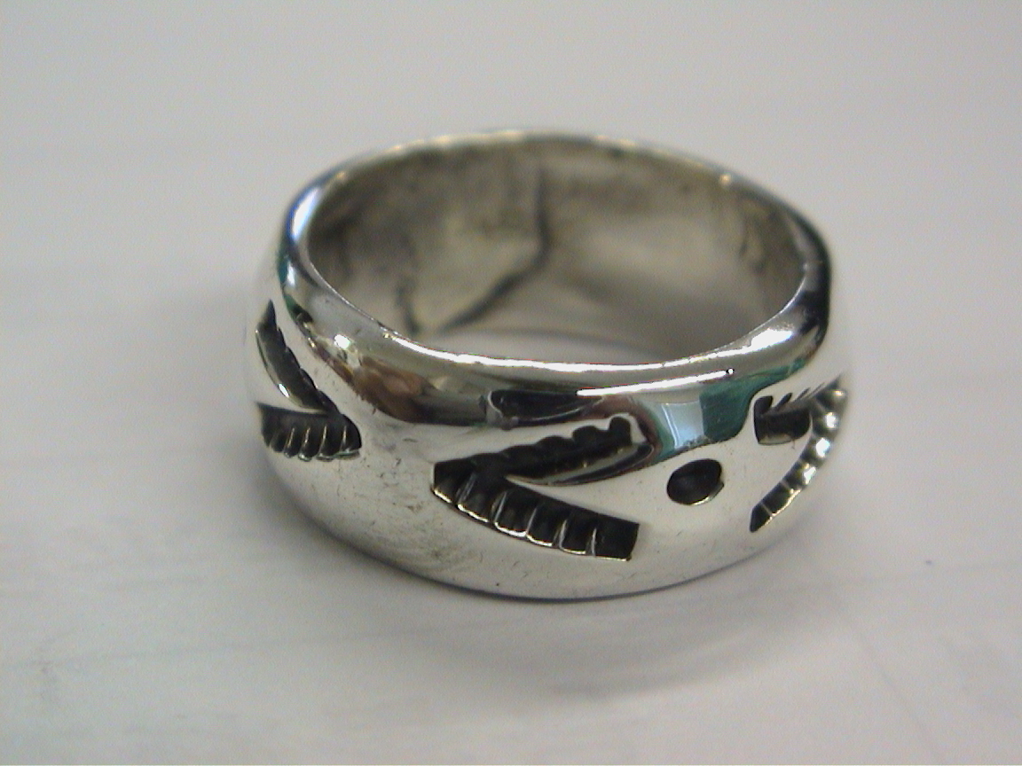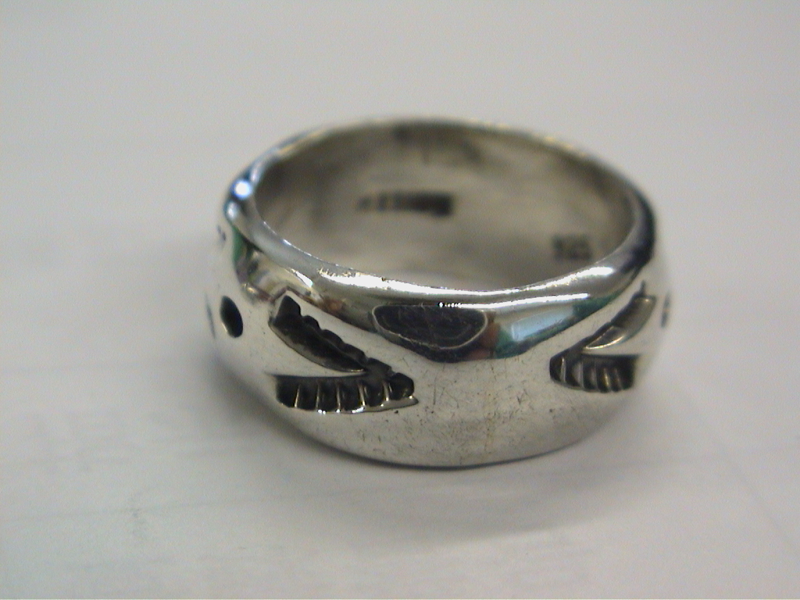 925シルバー製デザインスタンプ甲丸リング11号新品。