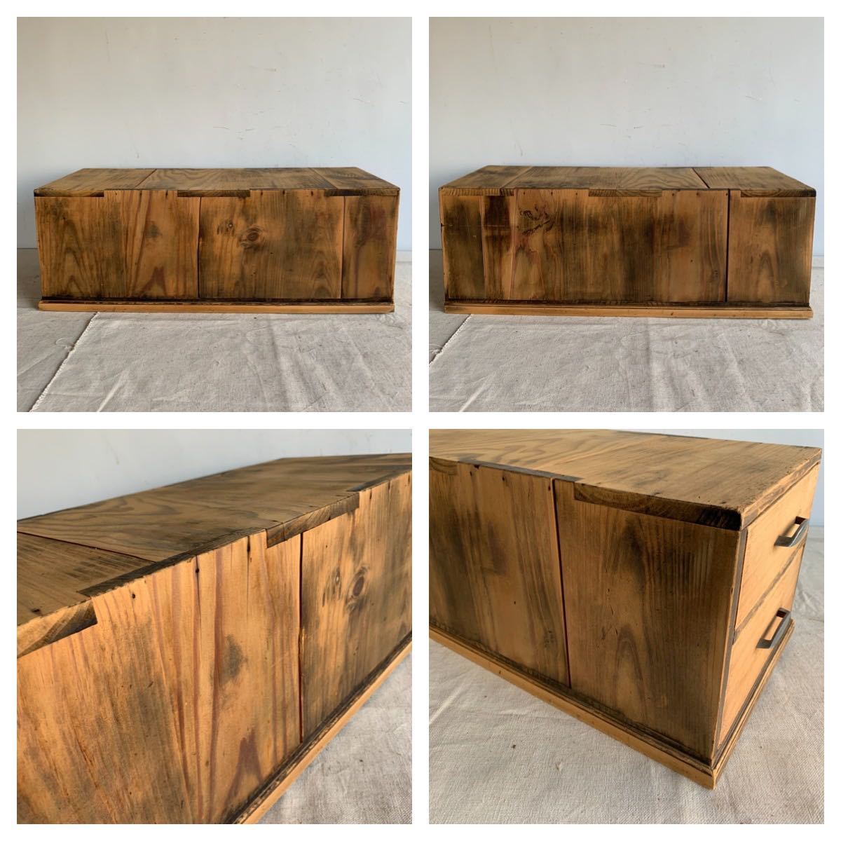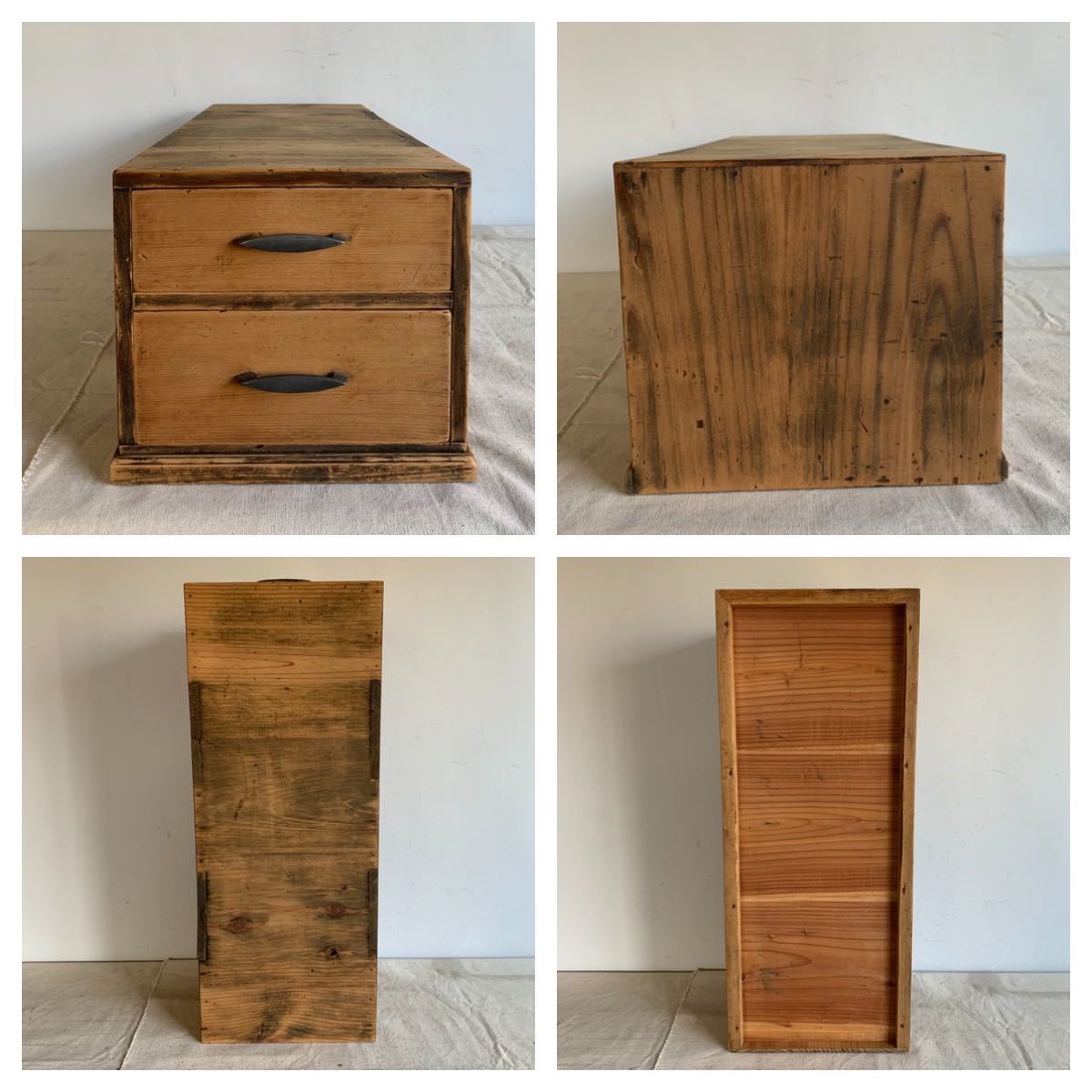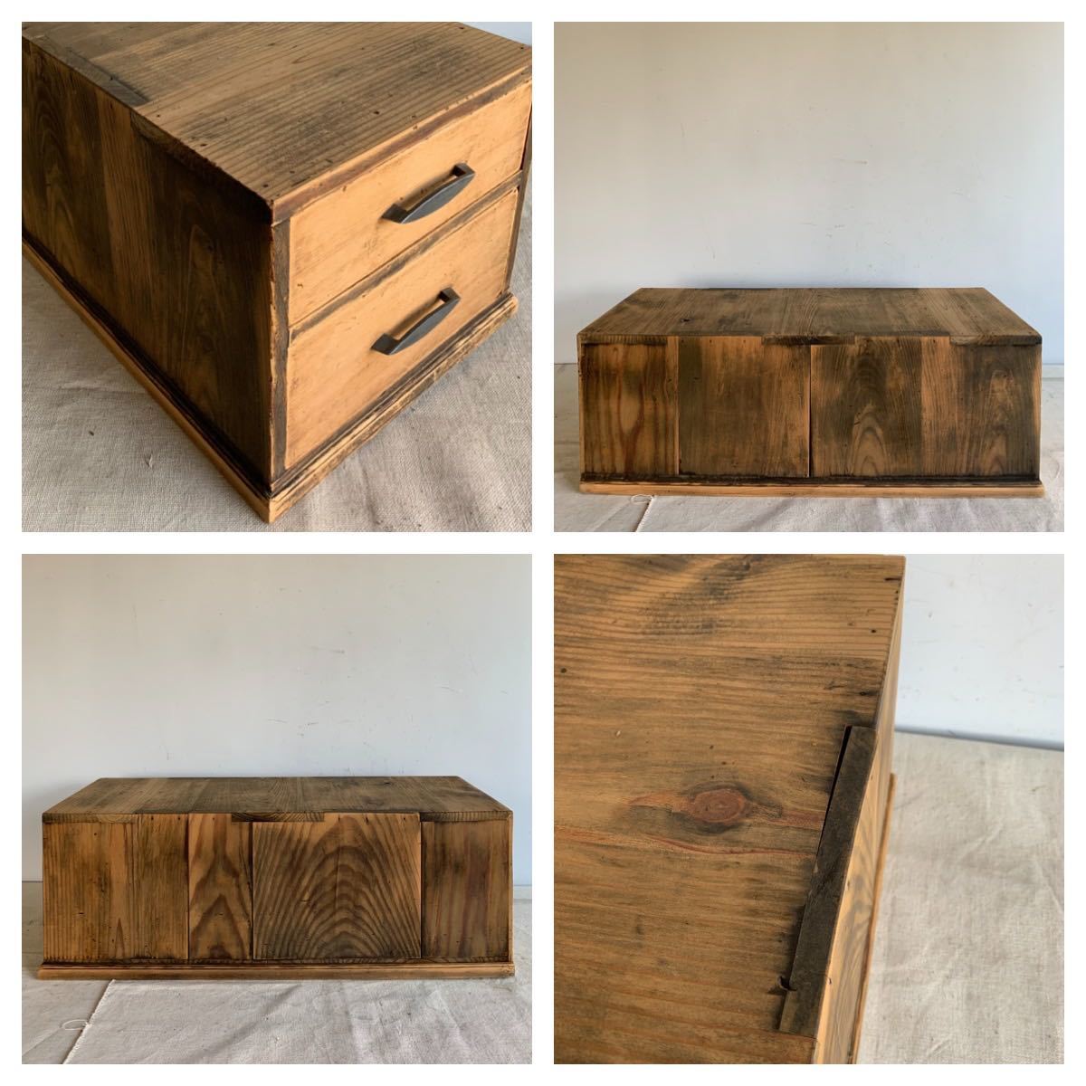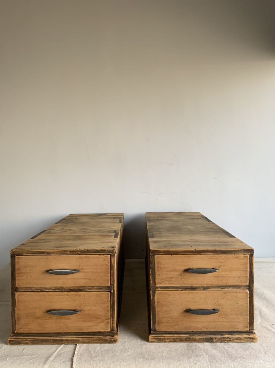 A4サイズが入る全て無垢材が使われている木製の2杯引き出し2個セットです。奥行きのある作りで上に板などを渡せば、ローテーブルが作れます。小物や書類、文具などを収納する小家具としてお部屋のインテリアやお店の什器として使って頂くと素敵だと思います。引き出しはスムーズです。2枚目の画像にある通り、引き出しの奥行は外側のケースより短いです。