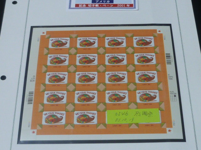 20 S アメリカ切手 №246 2001年 記念 切手帳・ペーン 感謝祭・他 シール式 計2点 2リーフ 未使用NH