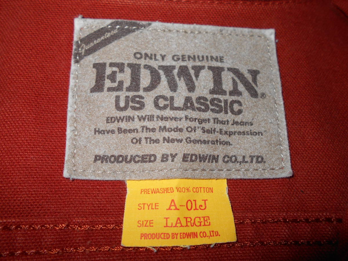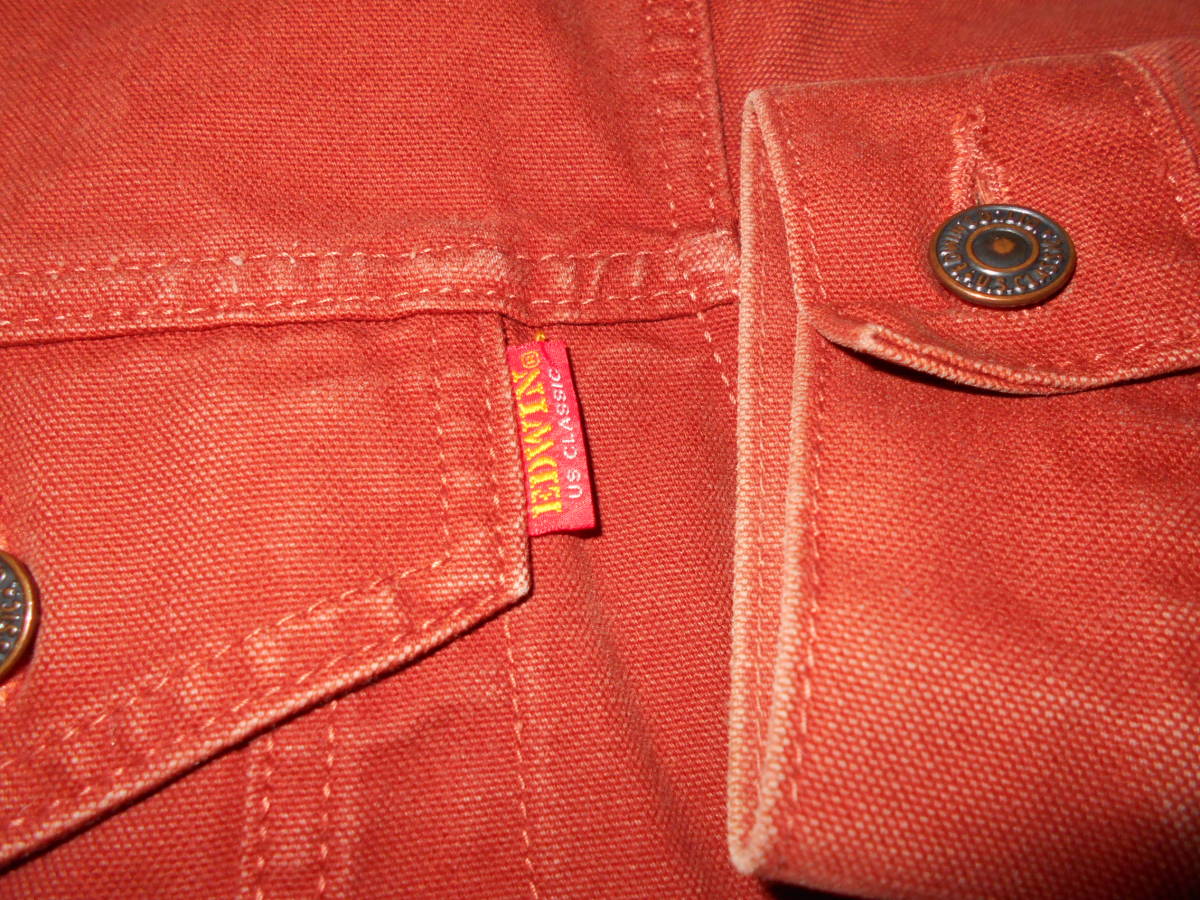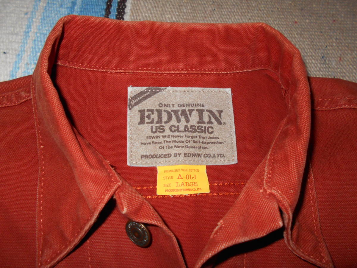 1980年代製 EDWIN の名作 「A-01J 」、ハイオンスのコットンダック素材感、旧染料ブリックレッドの風合いある発色、イエローロゴの大きいオレンジタブ、クラシックパッチ、頑丈な「SCOVILL」製 カパ-ボタン、太番手ステッチ縫製  等等...ディテールまで極めて良いテイスト