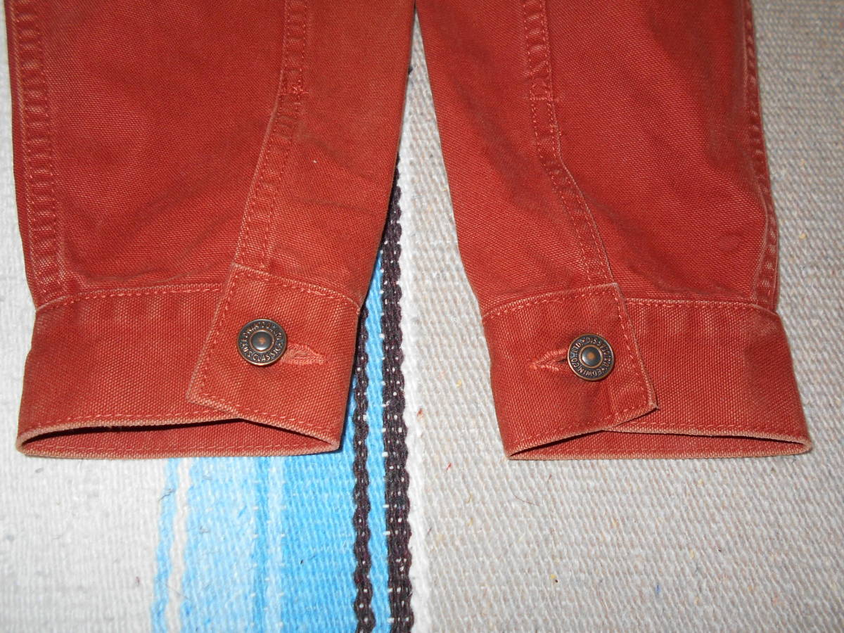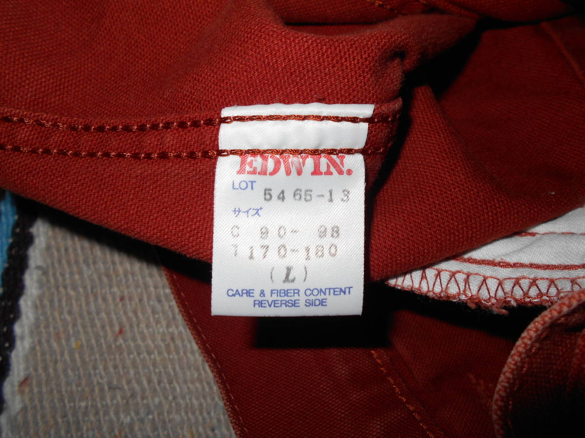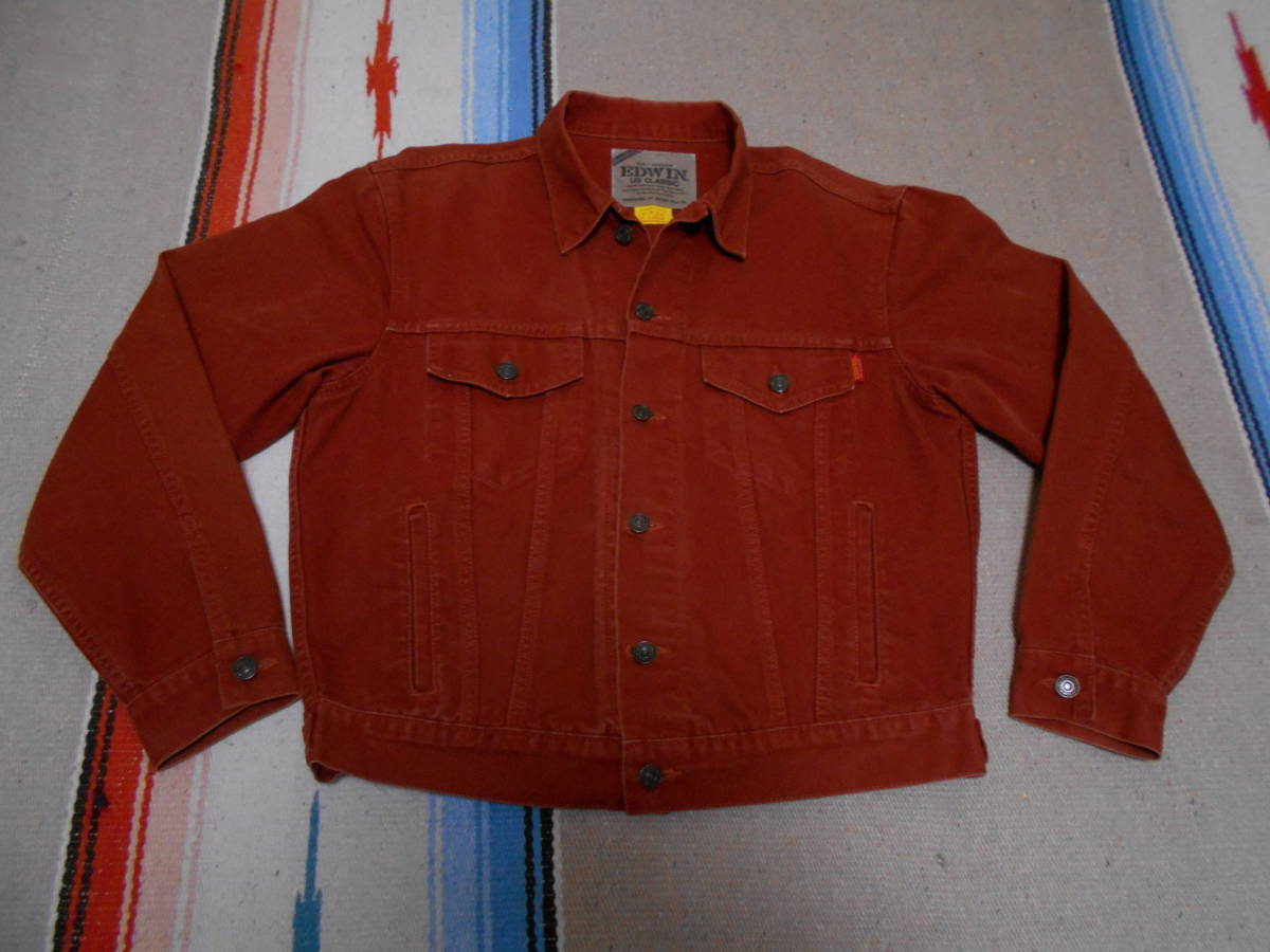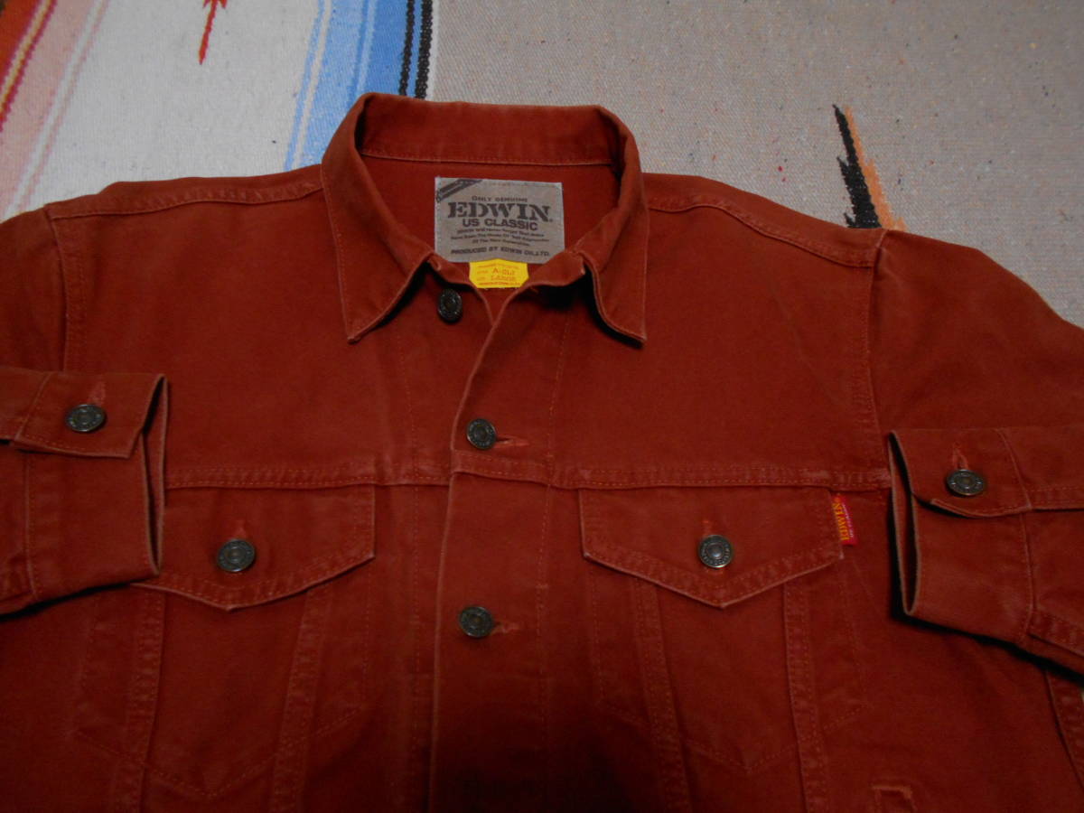 1980年代製 EDWIN の名作 「A-01J 」、ハイオンスのコットンダック素材感、旧染料ブリックレッドの風合いある発色、イエローロゴの大きいオレンジタブ、クラシックパッチ、頑丈な「SCOVILL」製 カパ-ボタン、太番手ステッチ縫製  等等...ディテールまで極めて良いテイスト