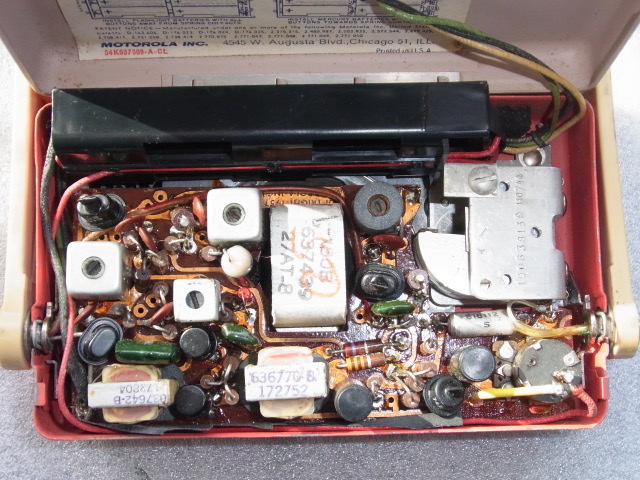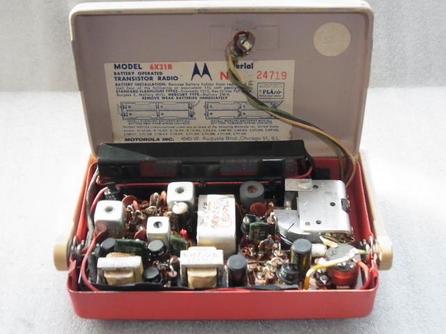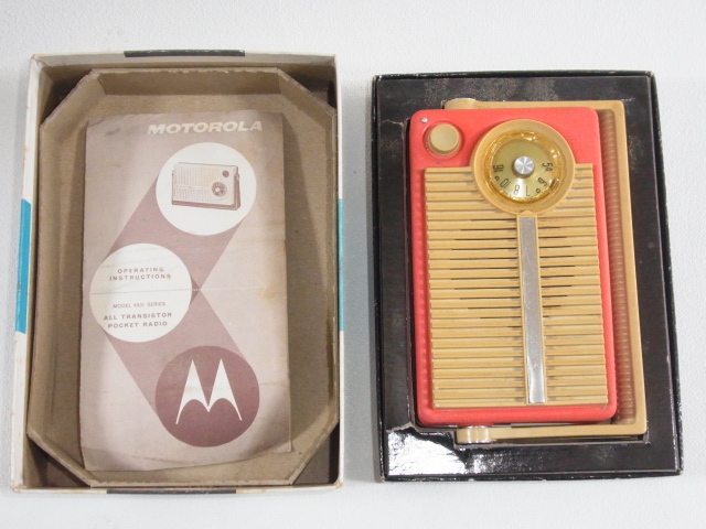 米国 Motorola 製の6X31R、初期の6石トランジスタラジオでシルクハット型、UFO型等のトランジスタが使われております。 キズや汚れは殆ど見られませんが裏蓋に傷が在り、前面のアルマイトのところに本来在る Motorola のロゴは消えております。 動作は良好ですが本来はもう少し音量が有るのでは無いかと想われますがオリジナルのままとしてありますがご希望が有れば別途レストア可能です。 電源は単3x4本ですが電池ホルダーに一部破損が有りますが実用上は問題ありません、 サイズは約160x105x45mm、キャビネット本体は金属製です。 オリジナルの取説、元箱、ダンボール箱付で内側に一部破損が見られます。 横浜市から佐川急便でお送り致します。 ◎落札後24時間以内に連絡が取れ、48時間以内に支払いが完了する方以外の入札はご遠慮下さい。 送料は九州宛ての送料をシステム上仕方なく記しますが実際の差額は切手で清算させて頂きます。 *転売目的の入札は固くお断り致します。