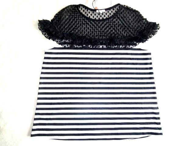 ● MANOUSH マヌーシュ 新品 カットソー Tシャツ 38 M 半袖 トップス ストライプ レース ノースリーブ 黒 白 コットン フリル 水玉