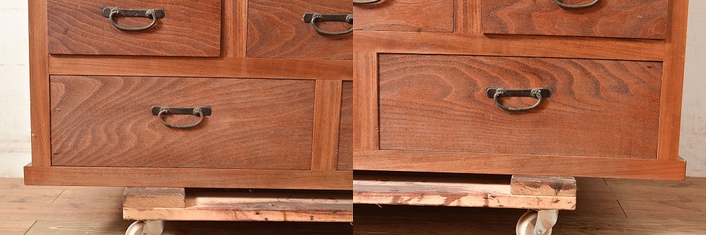 和製アンティーク 前面ケヤキ材 和の趣きを感じさせる、赤味がかった色合いが魅力の箪笥サイドボード(関東水屋箪笥、キャビネット、収納棚)(R-049152)