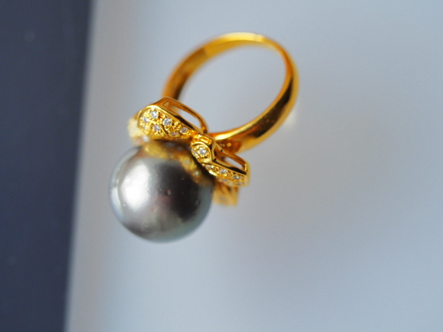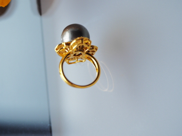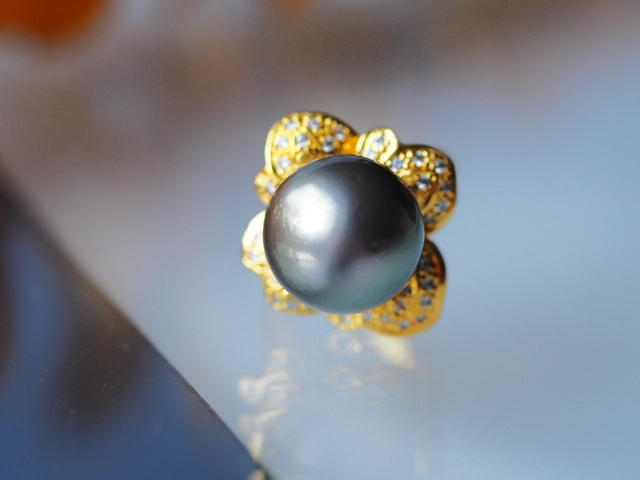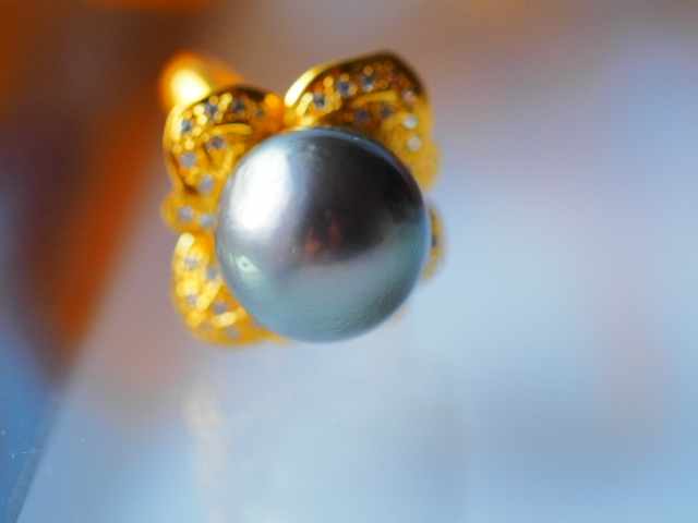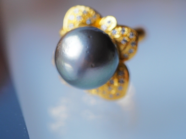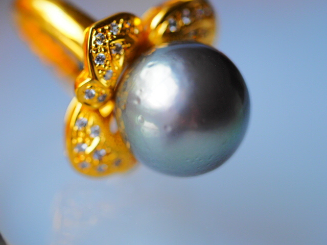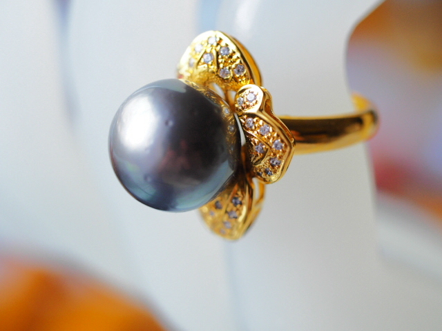 天然の細かなくぼみはあるものの、非常に質の良い黒蝶真珠を使用したリングです。