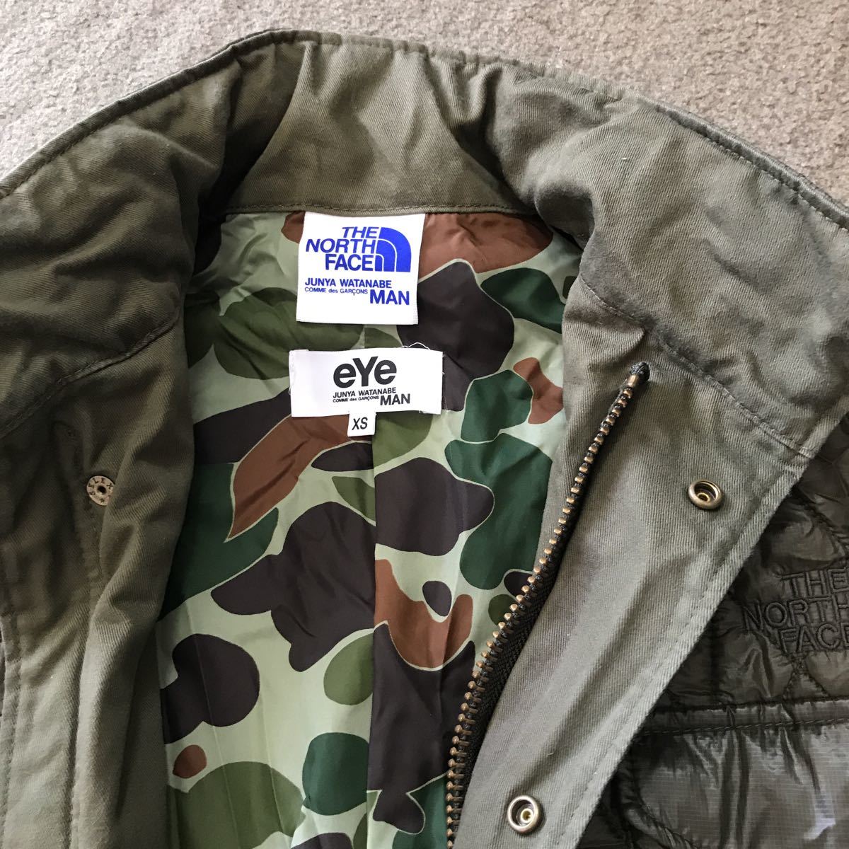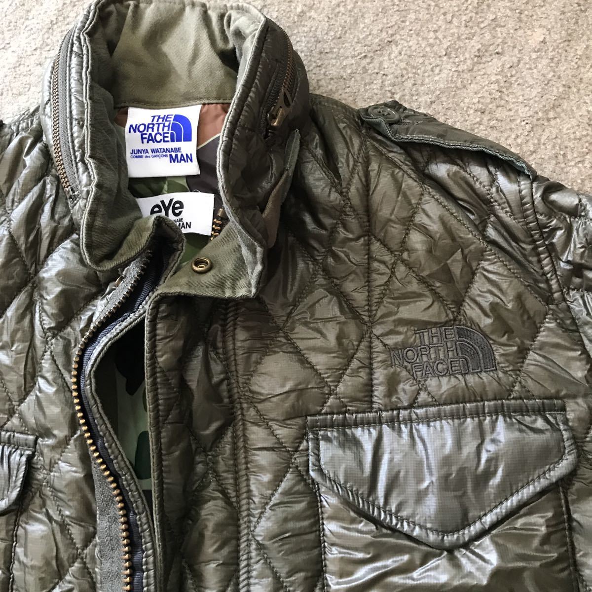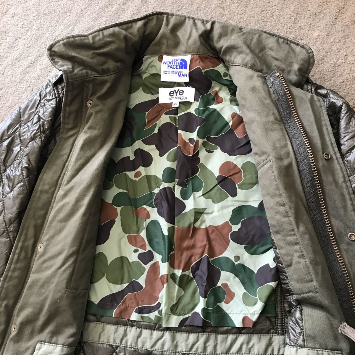 数回着用 ジュンヤワタナベマン×ノースフェイス迷彩中綿ジャケットです。XSサイズ、カーキ、ナイロン100%、中綿は綿100%です。実寸は肩幅39、身幅49、着丈65、脇下袖丈43cmです。今は売ってないモデルです。