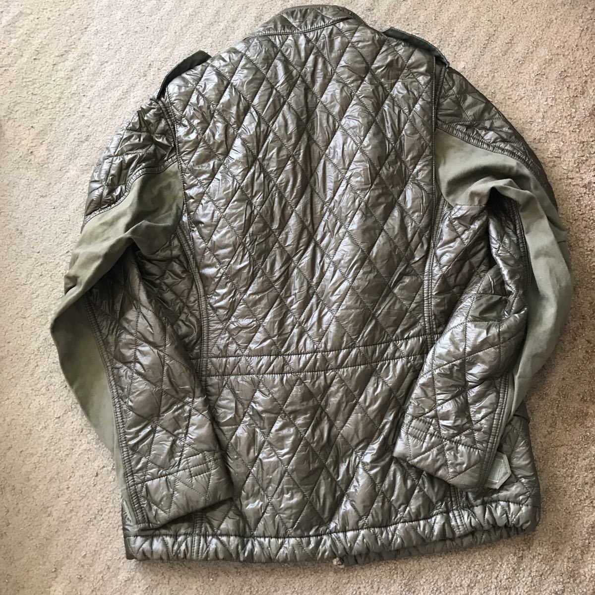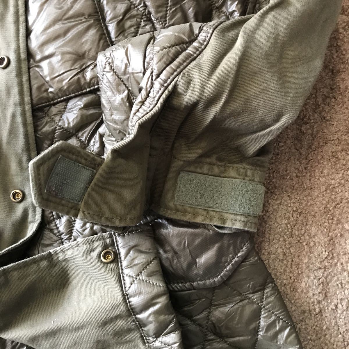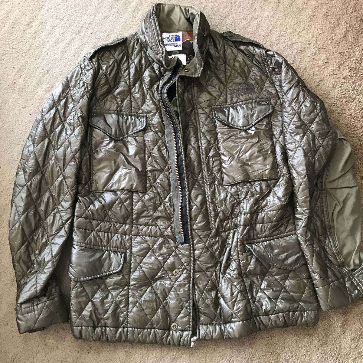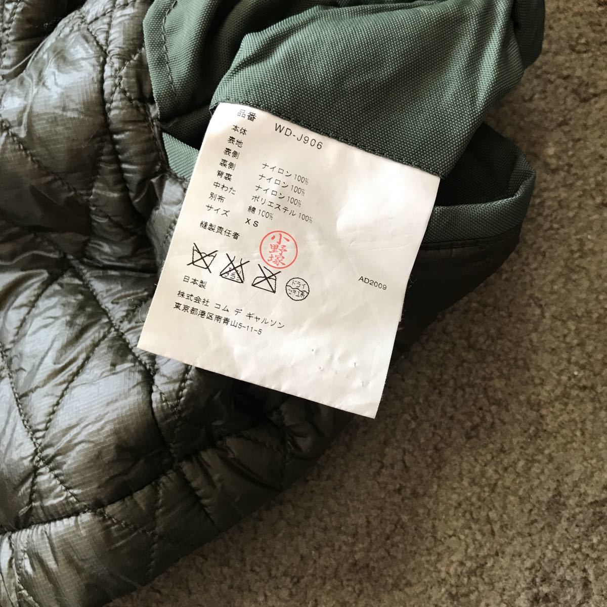 数回着用 ジュンヤワタナベマン×ノースフェイス迷彩中綿ジャケットです。XSサイズ、カーキ、ナイロン100%、中綿は綿100%です。実寸は肩幅39、身幅49、着丈65、脇下袖丈43cmです。今は売ってないモデルです。