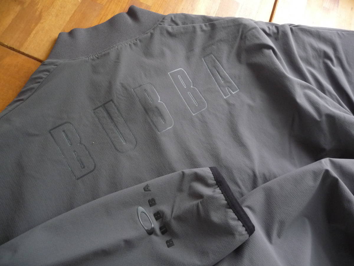 左の袖先にBUBBAとアイコンパッチ、左胸にアイコンパッチがある