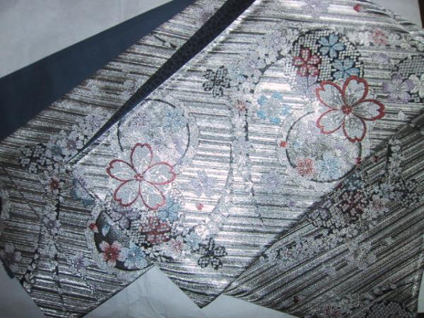 なお、帯柄左上に無地で出ているところは裏無地で、柄と柄の間に出ているところは手先と前太鼓のあいだの無地部分です。六通柄です。金銀糸が多用されているためストロボの照りで、しろぽく写っている部分があります
