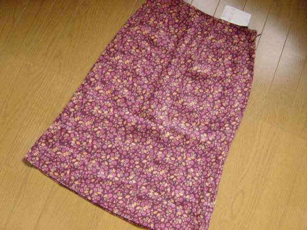 新品タグつきの東京スタイルの22OCTOBREブランドの、ワイン色スェード調地にオレンジと濃ピンクの小花柄をあしらった6枚はぎスカートです。