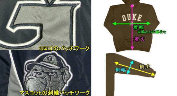 本体は光沢があり、動くとシャカシャカ音の鳴るポリエステル生地、Gロゴはパッチワーク、左袖のジャック(ブルドッグ)は刺繍のパッチワークです。