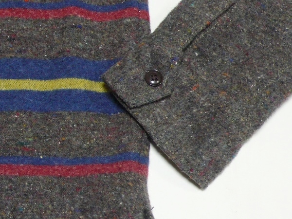 | アメリカン・カジュアルに和のモチーフとハンド・クラフトの手作り感を取り入れた落ち着いたカジュアル・ウェアを展開するブランド「THIRD SIX サード・シックス」のアメカジをベースにストリート感を盛り込んだシリーズ「CHAKA」のウール・ブランケツトを使用した「フロント・ジップ・ウールシャツ」になります。サイズは4でメンズMEDIUMになります。カラーはミックス・グレーで50年代のデニムジャケットのライニングに使用されていたウール・ブランケットを再現したネップ感のあるボーダー・ブランケットを再現したカラーになります。ウールXポリエステルXレーヨンXアクリルを組み合わせた混紡ウール素材を使用したワーク・ブルゾン・スタイルのフロント・ジップ・シャツでフロントはジップ・アップでジッパーはYKK製セミ・オートマチック(YKK4YG)を使用、フロント両胸にパッチ・ポケットが付き右ポケットはコットン・シャンブレー生地を縫いこんで縁補強が施されたボタン付きポケット、左はコットン・シャンブレー生地を裏地にしたペン差し付き台形ポケットでヴィンテージなワーク・スタイルを再現しています。身頃内側にウォレット・ポケット。ボタンはアンバー(こげ茶色)の樹脂ボタン、襟はロング・ポイント、台襟内側と肩裏部、袖口内側にコットン・シャンブレー生地(ブラック・シャンブレー)が縫いこまれて補強されています。ヴィンテージ・ディテールを盛り込んで、日本国内で丁寧に縫製された高級感のある仕上がりになっています。状態は全体的に使用感の少ないきれいな状態で着用による衿周りや袖口など肌の直接触れる部分のスレなども無く、保管時の虫食いによる穴あきや破れなどのダメージも無く、試着程度の使用感の非常に良い状態になると思います。実寸は肩幅(直線で)約46cm、身幅(腋下で)約53cm、着丈(襟下より)約68cm、袖丈約61cmとなります(素人採寸ですので、多少の誤差はお許し下さい)。素材表記はウール55%、ポリエステル30%、レーヨン10%、アクリル5%。日本製。 | |||