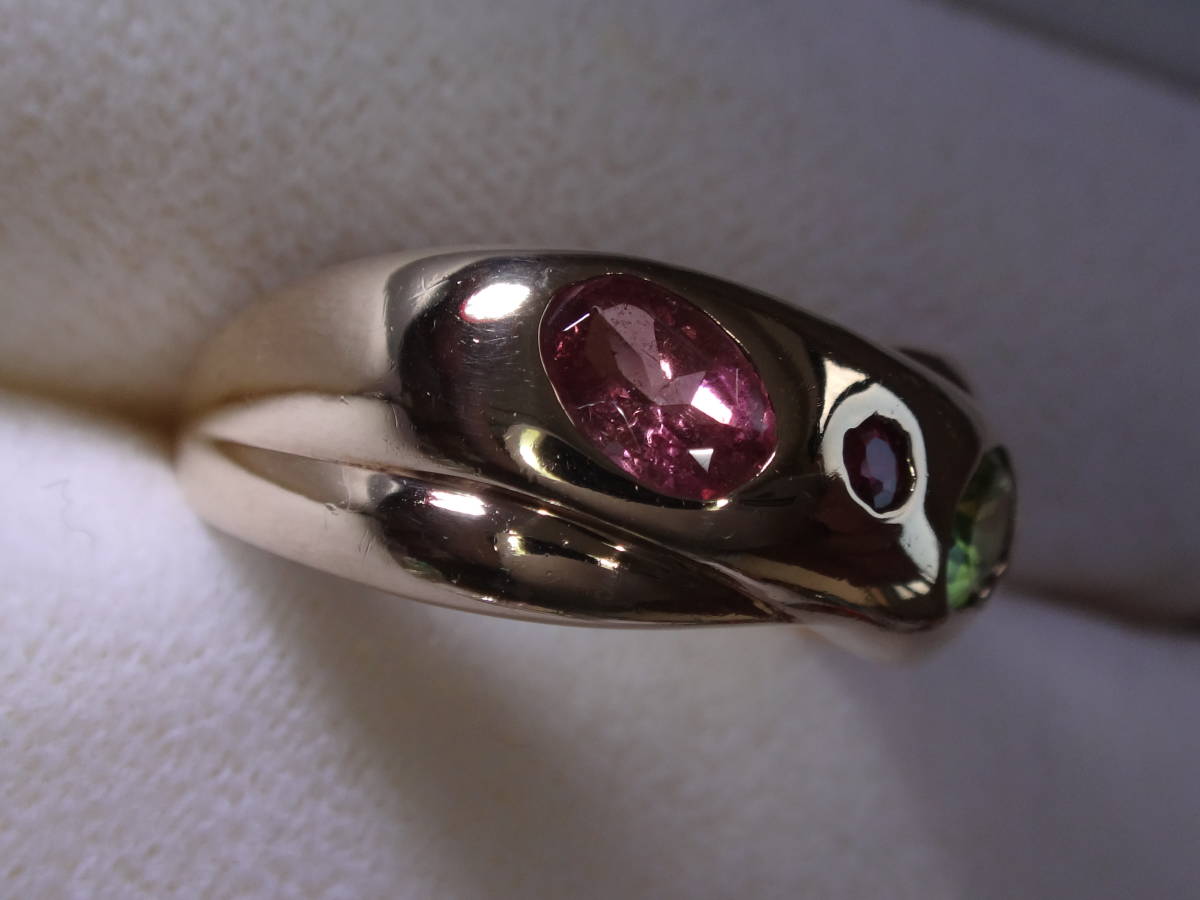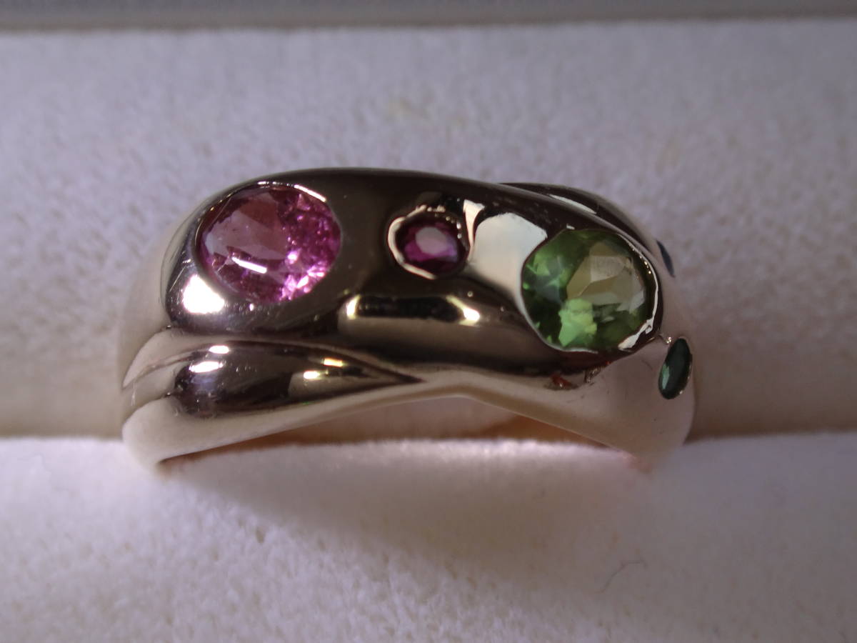 購入時の説明を忘れてしまったため石の詳細は不明ですが、恐らくメインの石がピンクトルマリンとペリドット、脇石がルビー、サファイア、エメラルドだと思います。