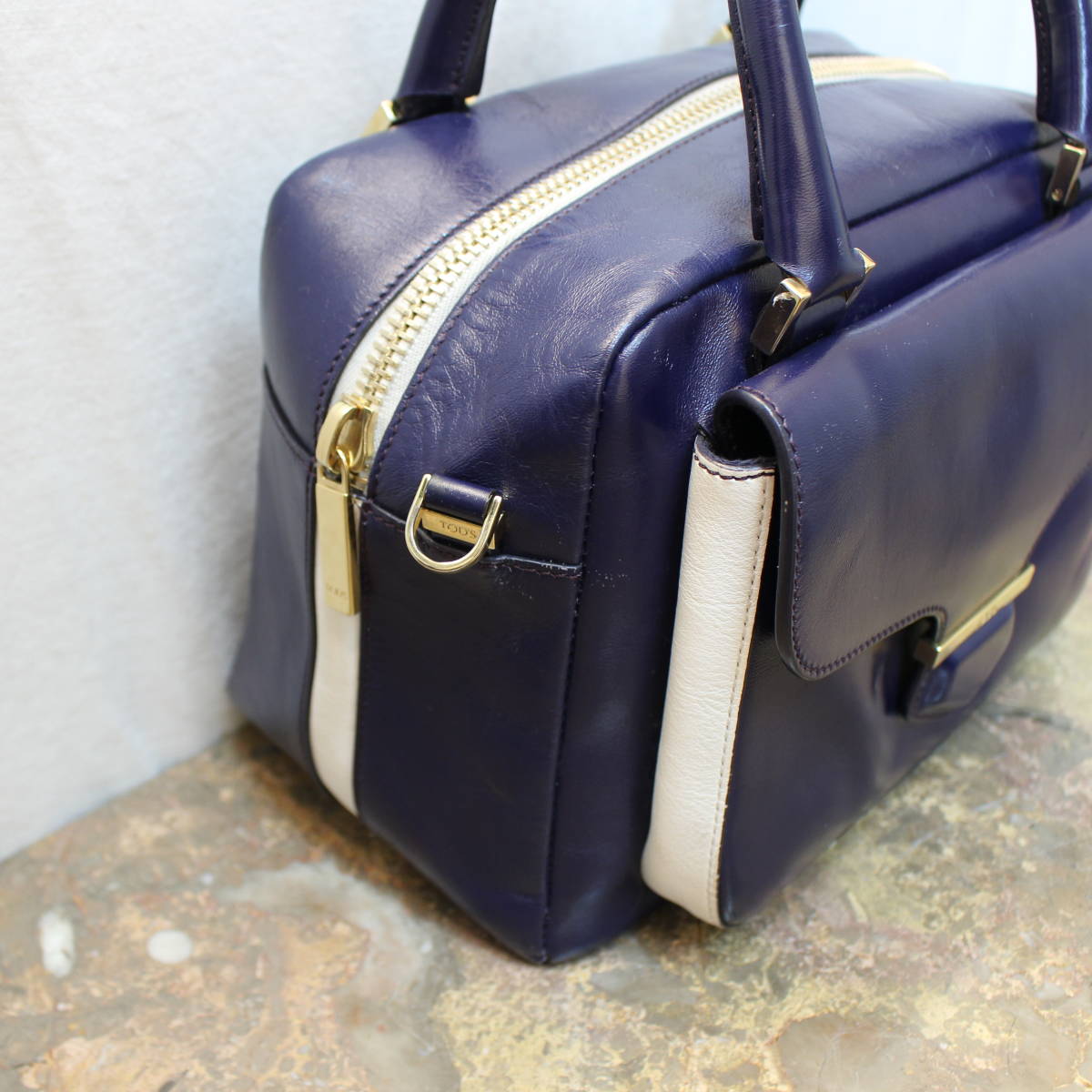 人気ハイブランドTOD'S。人気の加工レザーを使用したサッチェルバッグ。収納口も多く普段使いしやすいバッグ。バイカラーのデザインで、可愛いバッグです。