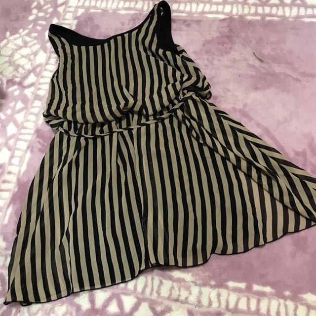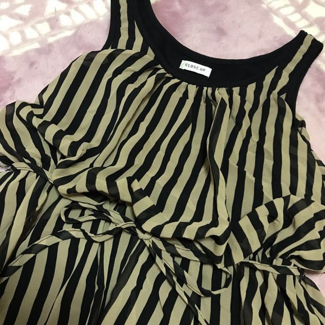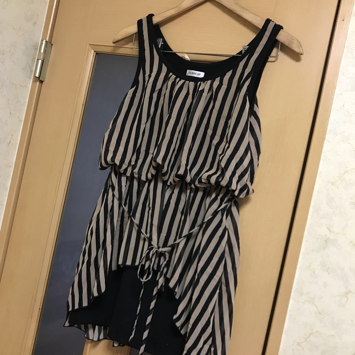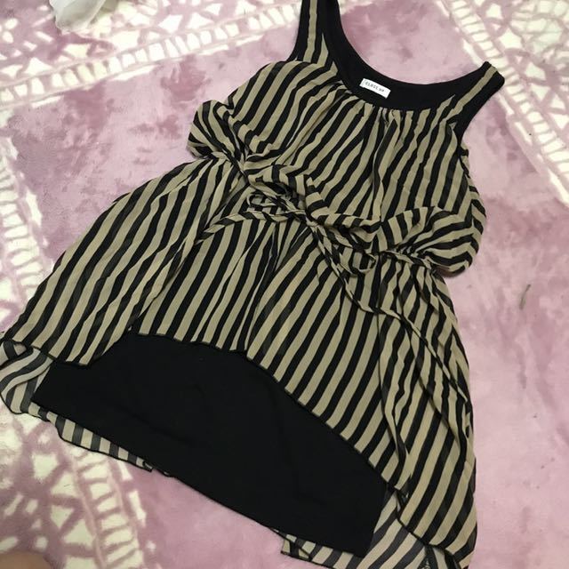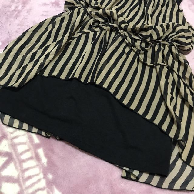 ◆デザインはゃゃロング丈のブラックのタンクトップの上にストライプのシフォン生地が重なっている感じで胸下ゴム入♪シフォン生地はふんわりタプッと胸下でだぶるデザイン♪下部のみ裏地付